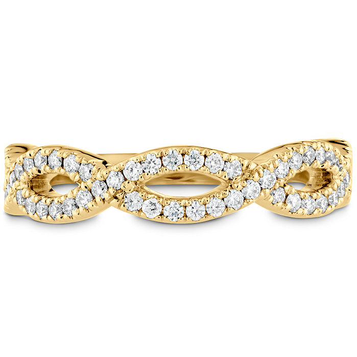 This stunning 18K yellow gold diamond band features 56 Hearts On Fire round diamonds, adding up to a total carat weight of 0.30, with a diamond color IJ, and clarity VS/SI, resulting in a truly unique and brilliant piece of jewelry. With a finger size of 6.5, this ring is the perfect fit for any hand. Elevate your style and make a timeless statement with the Destiny Twist Diamond Band from Hearts On Fire.