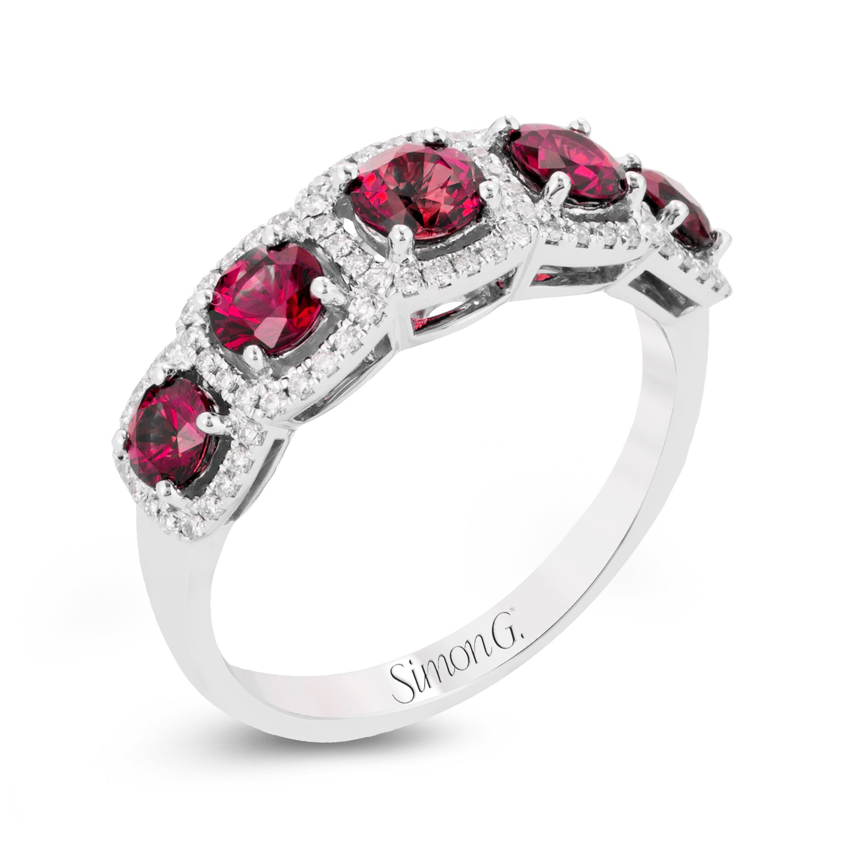 Simon G. 18k white gold Ruby and Diamond five stone anniversary style ring. Set with 5 natural Rubies with a total weight of 1.38ct, with fine red hue. Surrounded by round brilliant diamonds with a total weight of .21ct. This is a fine option for an anniversary ring or someone looking to add a little bold red color into their life.