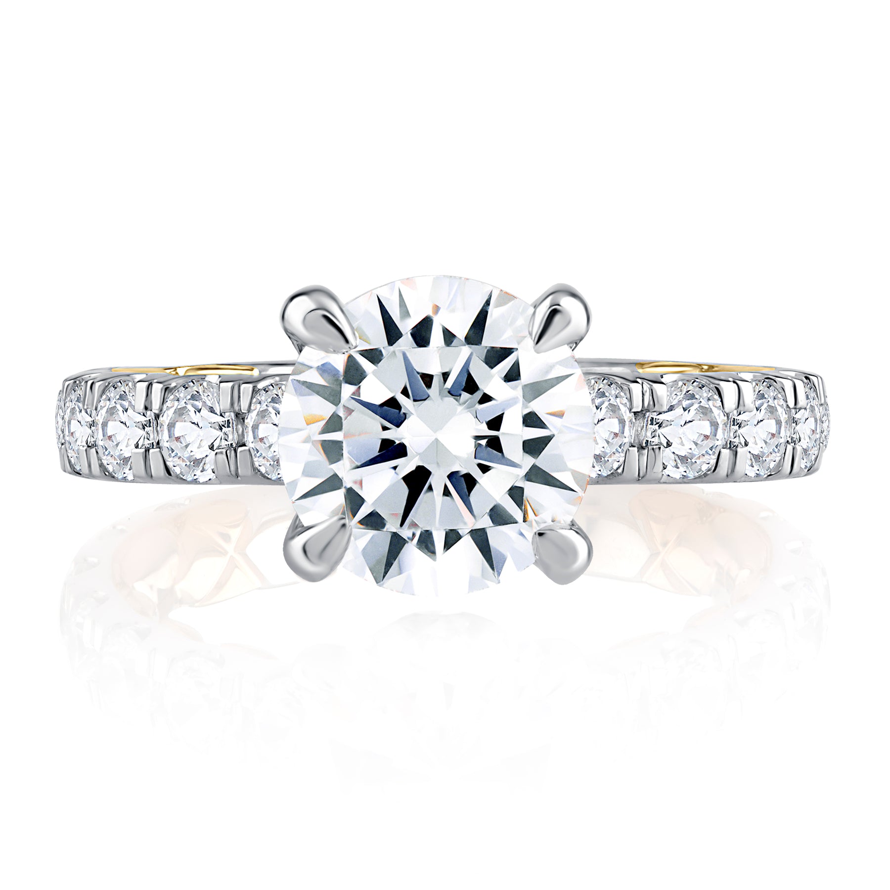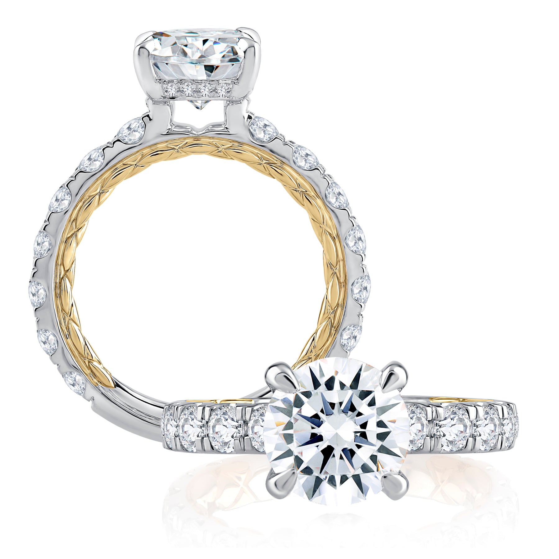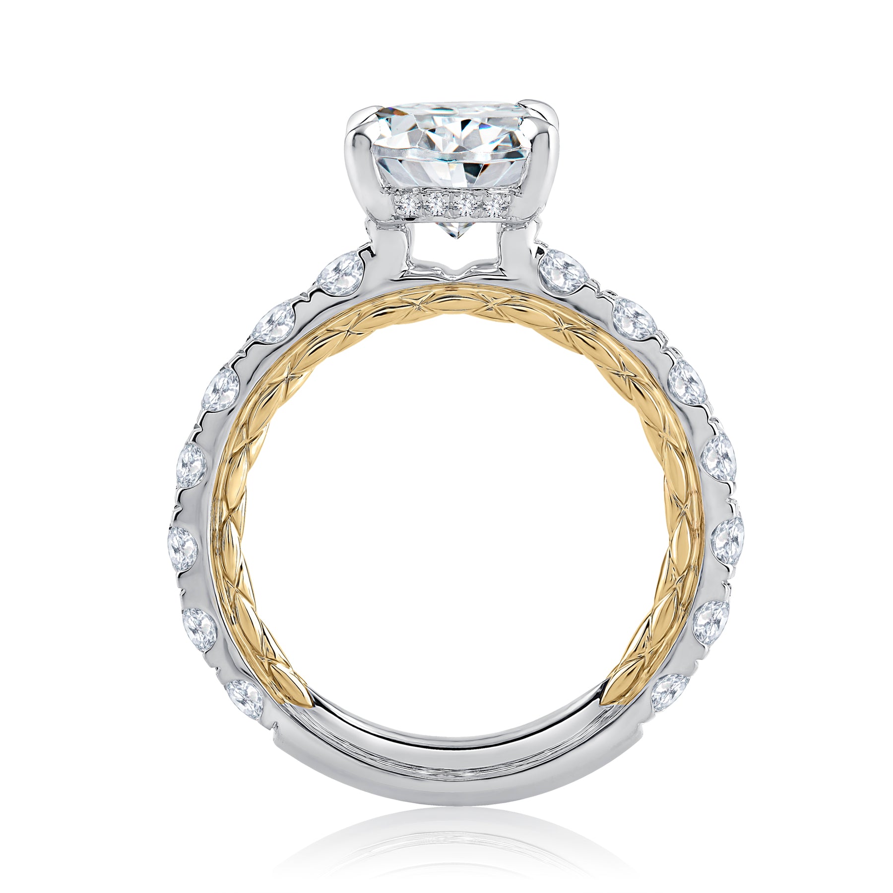 Large Diamond Band Engagement Ring with Round Center. This stunning piece is ready for a larger size of center stone ranging from 1.50ct- 5.00ct. A wonderful choice for someone looking for a larger diamond band look suitable for larger center stone. Shown with platinum and 18k yellow gold Quilted band. Also available in all Platinum. 1.50ct total weight of side diamonds.