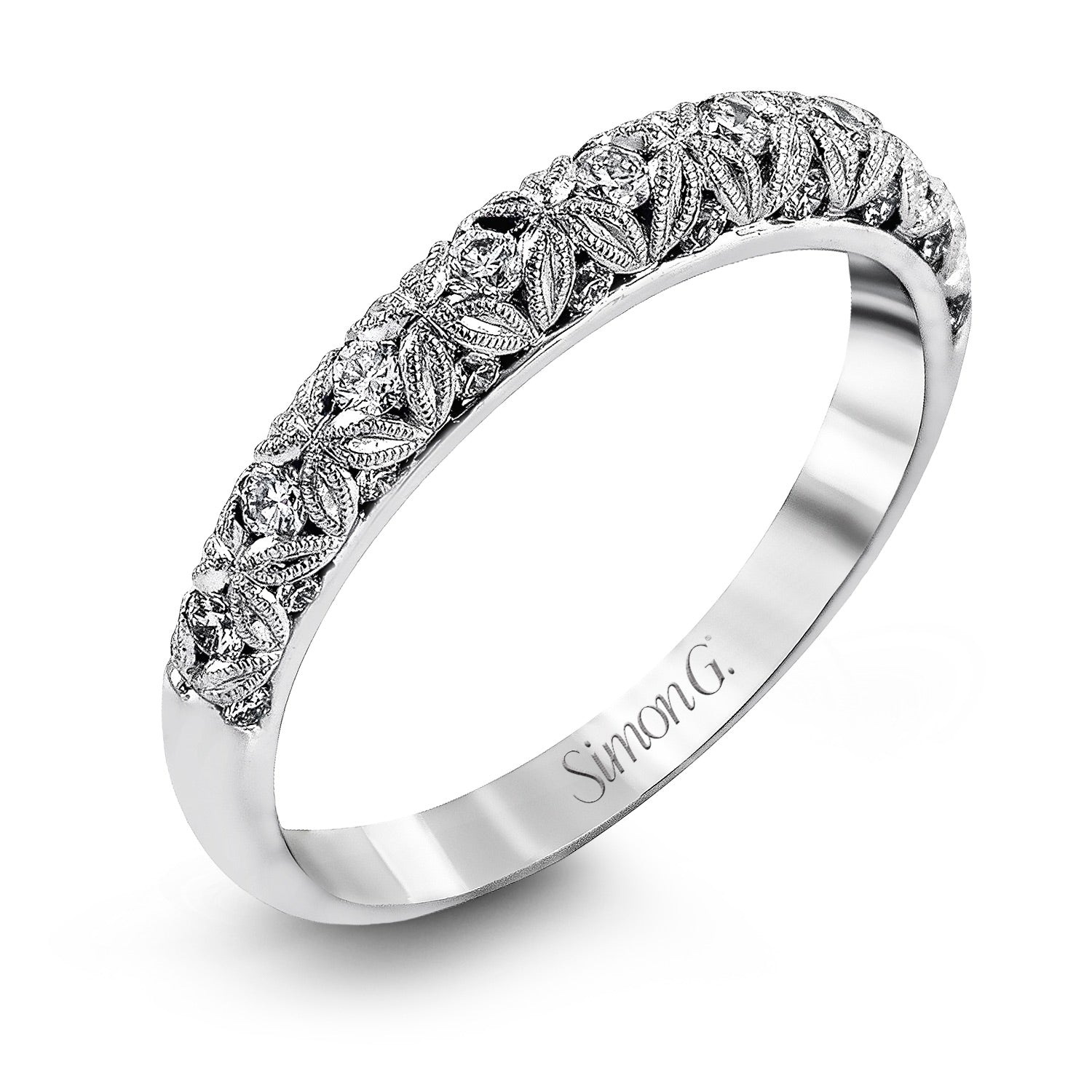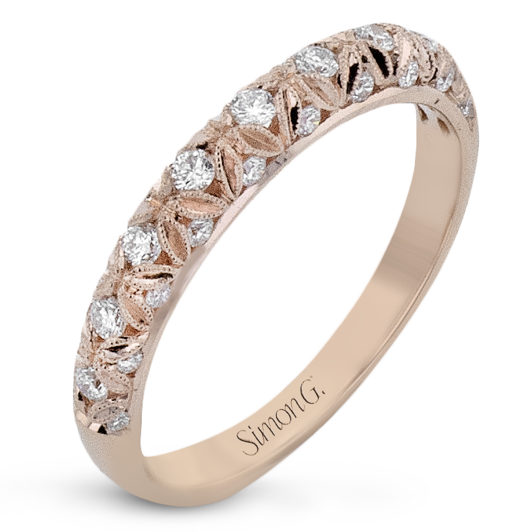 This intricate band has a floral, nature-inspired design adorned with sparkling diamonds.