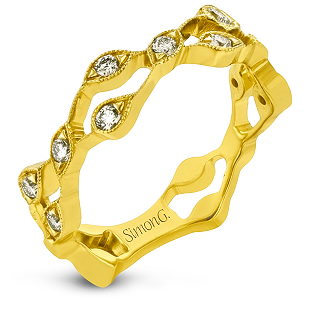 This elegant band by Simon G. features 11 natural round diamonds totaling 0.28ct, set in 18K yellow gold with intricate milgrain detailing. Designed in a marquise-inspired pattern and sized at 6.5, it’s perfect for stacking, weddings, or everyday elegance.