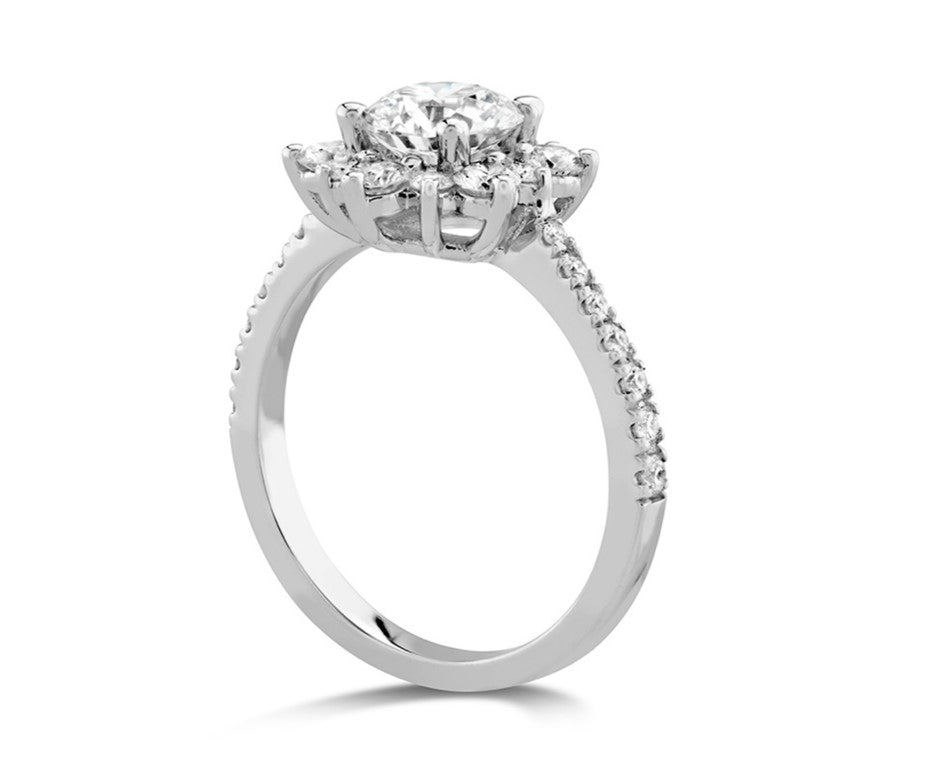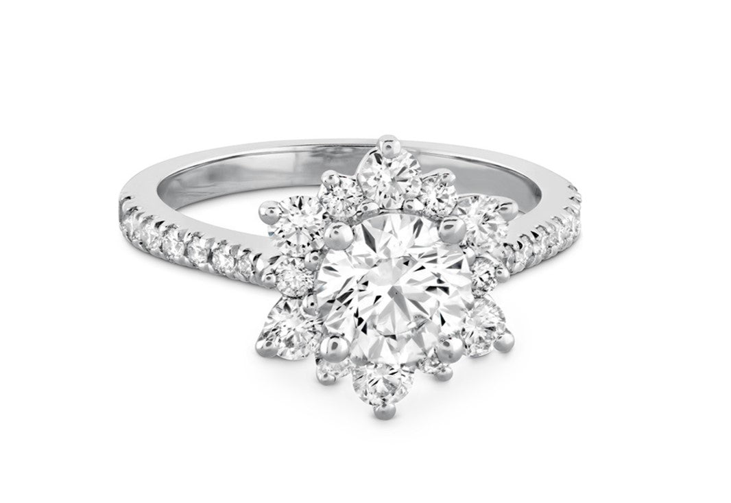 The Delight Lady Di Halo Ring in Platinum features a wreath of small diamonds surrounds a brilliant center stone in this design, which was inspired by Princess Diana’s iconic engagement ring. The snowflake-like silhouette of the setting is paired with a diamond band for a design that’s truly iconic.