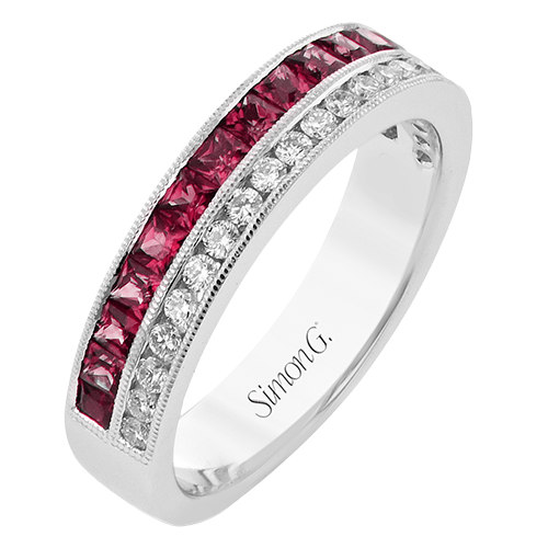 Double Row Ruby & Diamond Stackable Ring. This stunning white gold ring features two rows of sparkling gems - a row of white diamonds and a row of Rubies - totaling 0.27 carats and 0.87 carats, respectively. Accented by a delicate beaded edge, this classic art deco piece is perfect as a cocktail ring or addition to your stackable collection.
