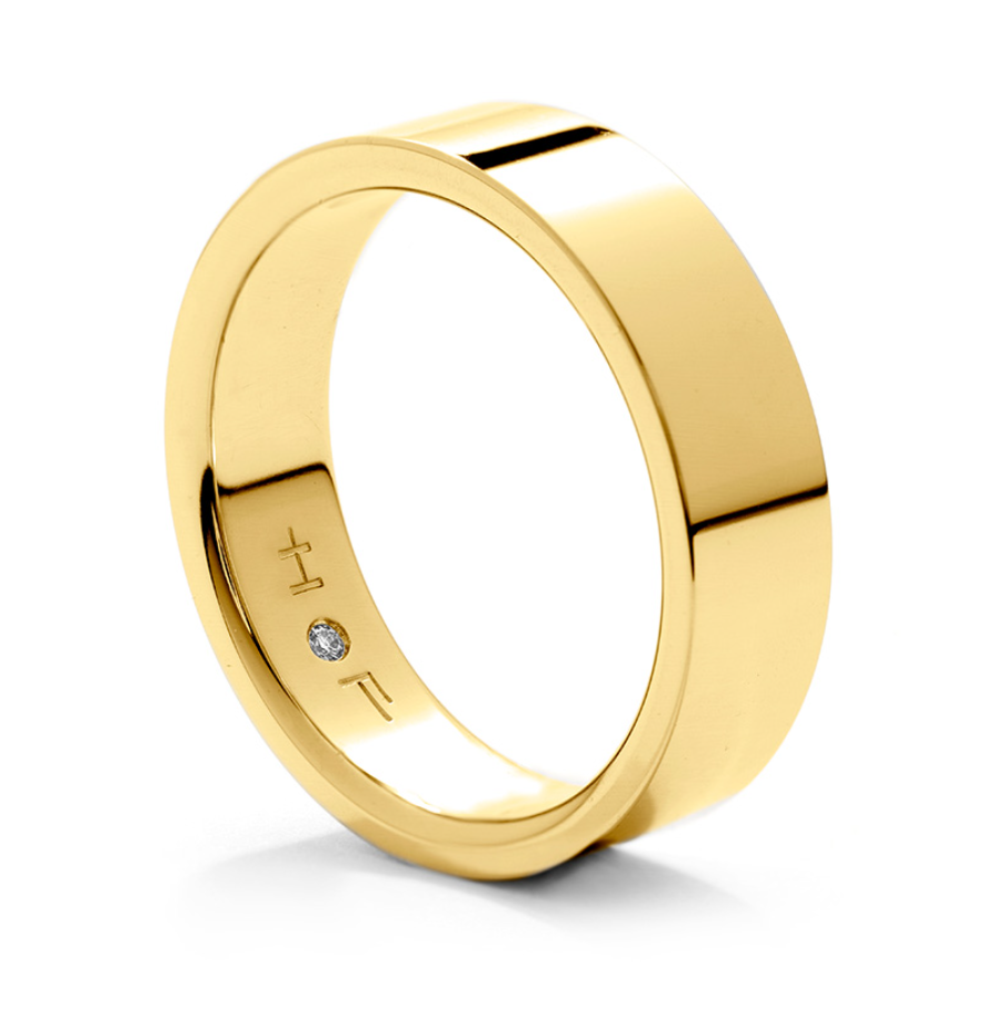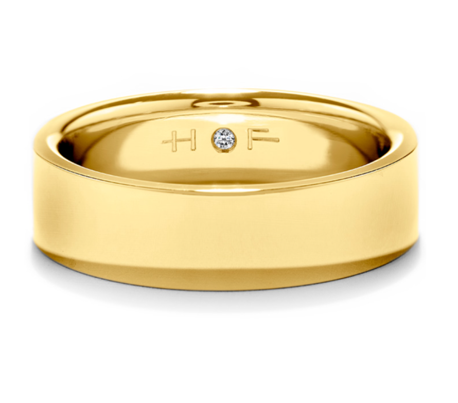 Style meets comfort in this 6mm Flat Cigar Band. This solid style combines a sleek design with unparalleled comfort. Set inside the band is one natural round brilliant Hearts on Fire Diamond weighing .01ct.