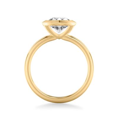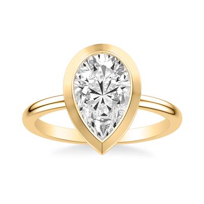 A modern and minimalist engagement ring crafted in 14 karat yellow gold with a high polish finish. The center features a natural pear cut diamond weighing 0.76 carat, color H, clarity VS1, measuring 7.60 x 5.41 x 2.35 mm. This diamond offers beautiful finger coverage with a graceful, understated profile.