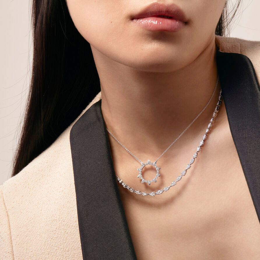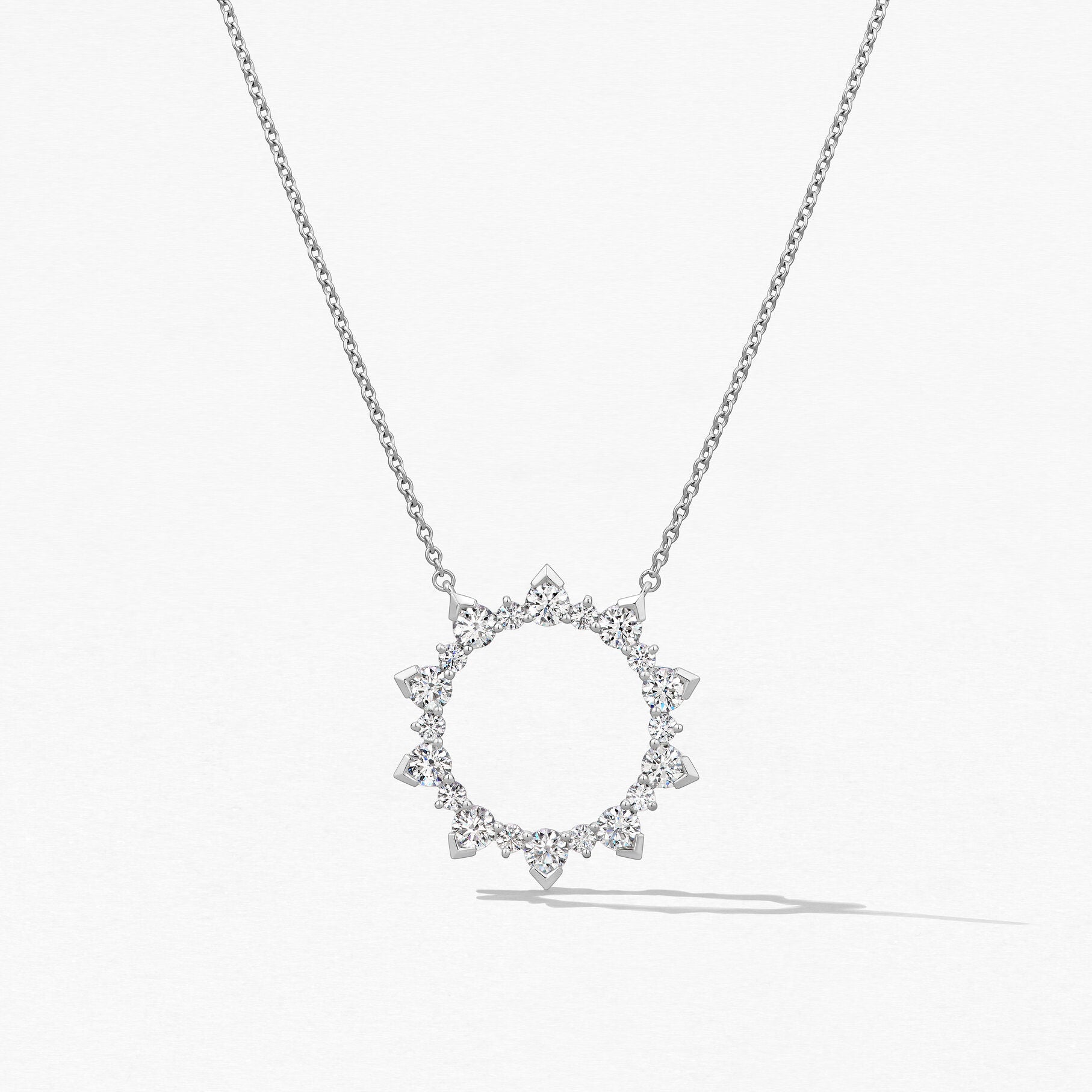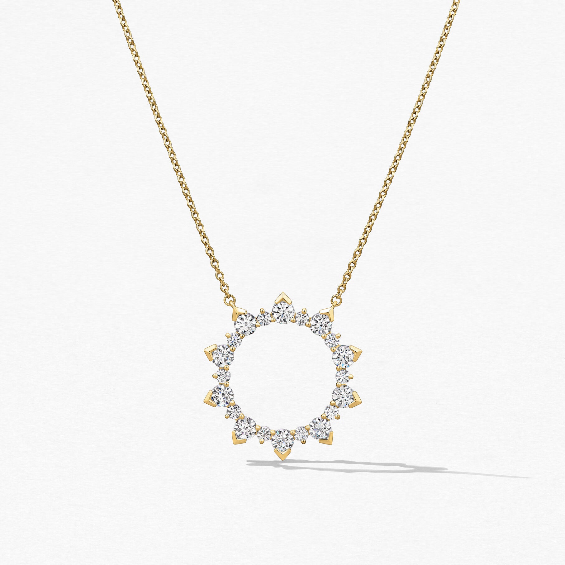 Radiate from within. This larger version of the Aerial Eclipse Pendant features a beaming sun-shaped motif made from a circle of luminous diamonds. It's versatile enough to wear alone or style with other pendants. Comes standard with an 18" chain. Additional lengths are available upon request.