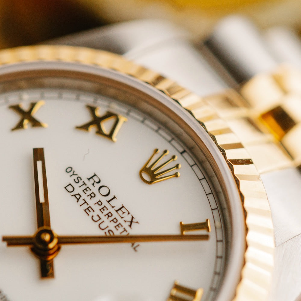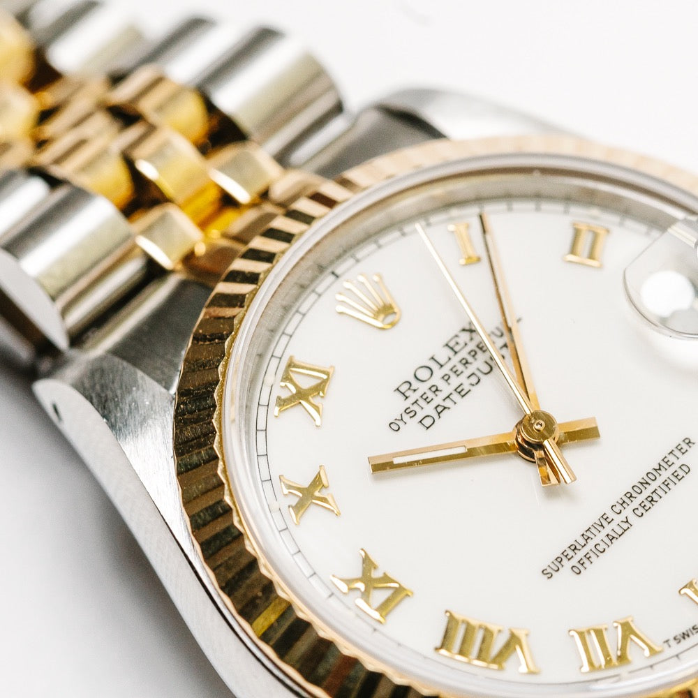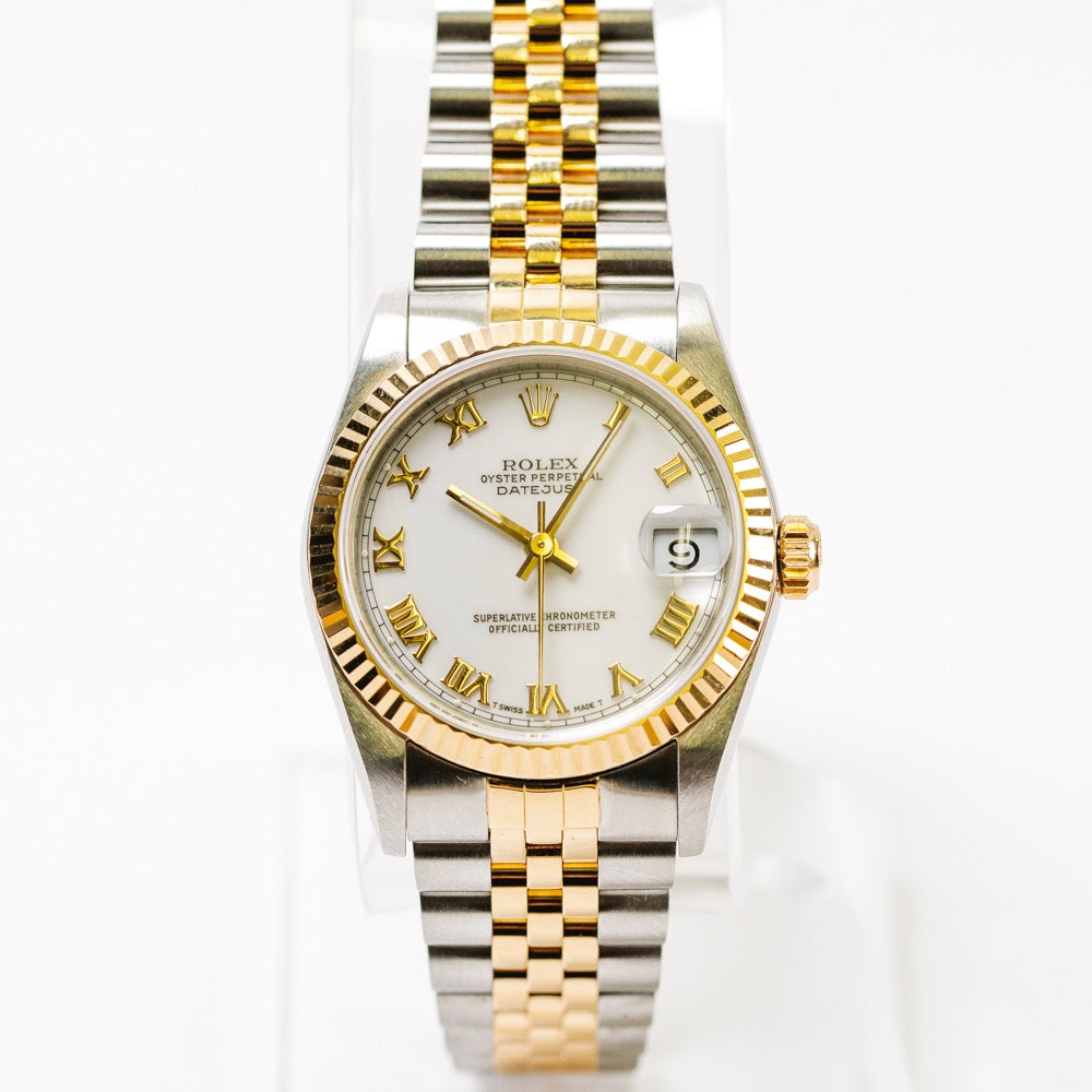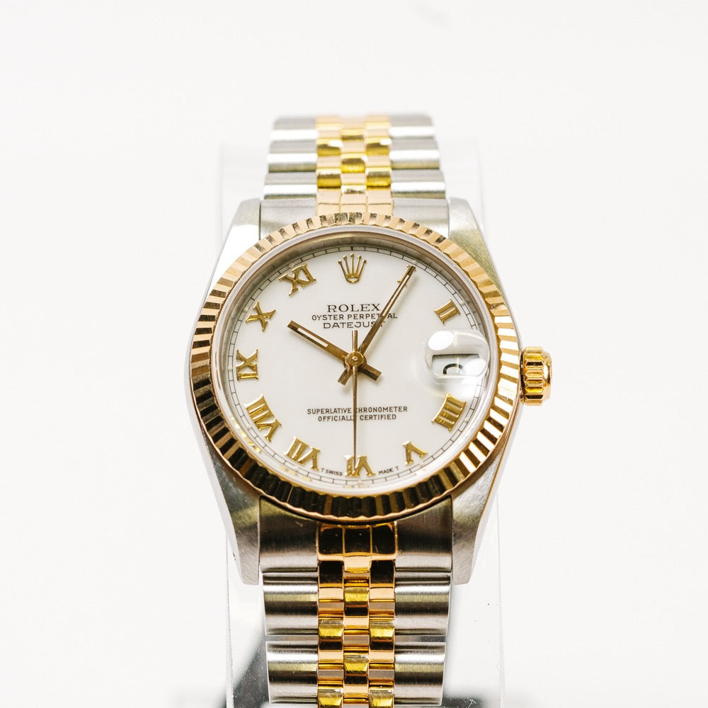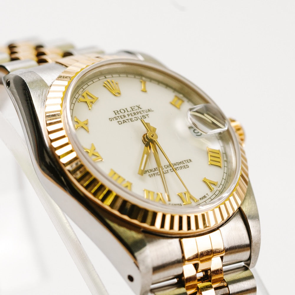 Discover timeless sophistication with the Rolex Datejust 31mm, blending steel and 18 karat yellow gold. Encased within a 31mm Oyster case, its pristine white dial boasts Roman numerals, radiating classic charm. The 18 karat yellow gold fluted bezel adds a luxurious touch, complemented by the iconic jubilee bracelet for unparalleled comfort and style. Powered by an automatic Rolex movement, meticulously serviced in-house by Jackson Jewelers in 2024, ensuring optimal performance. While lacking box or certification, Jackson Jewelers guarantees authenticity with a full in-house evaluation. This watch is in pristine condition, circa 1990 and featuring an E serial number.