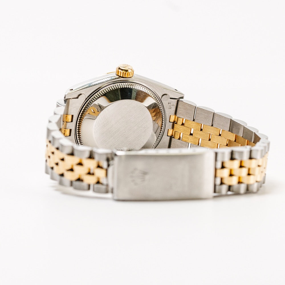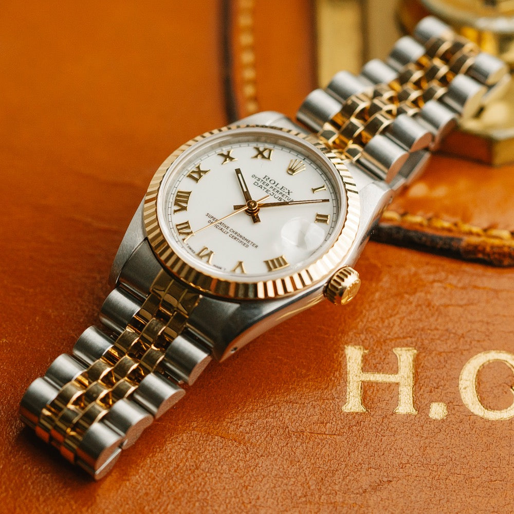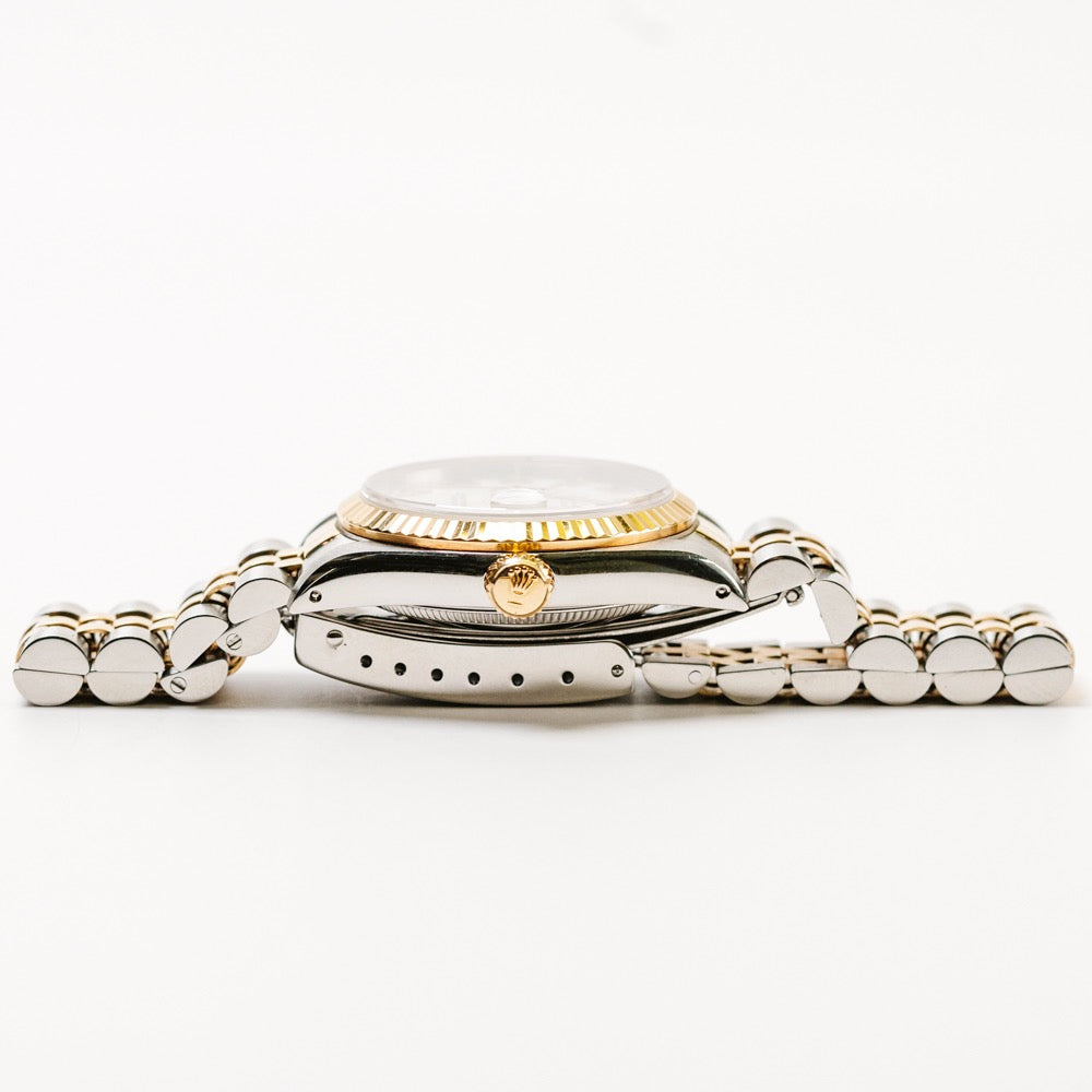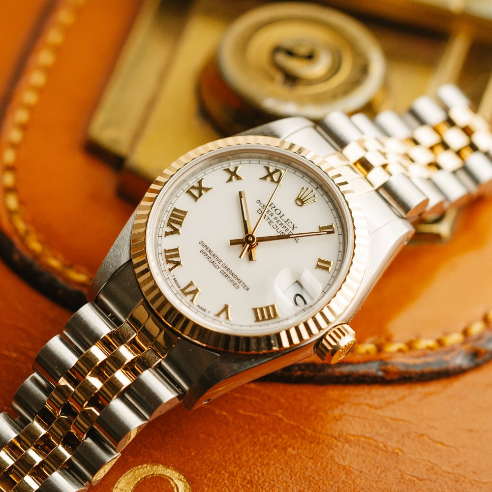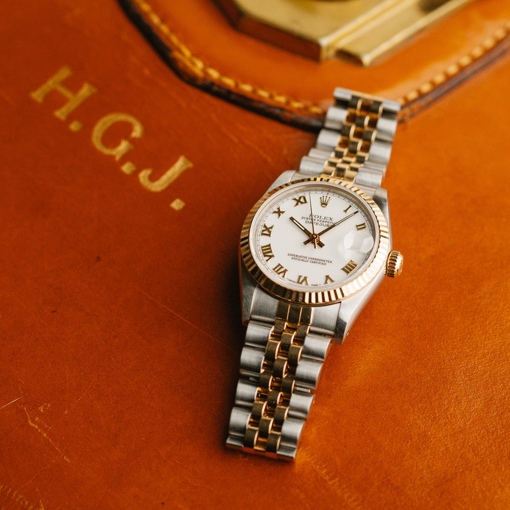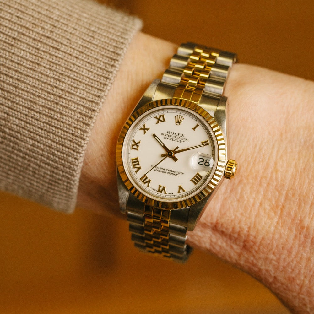 Discover timeless sophistication with the Rolex Datejust 31mm, blending steel and 18 karat yellow gold. Encased within a 31mm Oyster case, its pristine white dial boasts Roman numerals, radiating classic charm. The 18 karat yellow gold fluted bezel adds a luxurious touch, complemented by the iconic jubilee bracelet for unparalleled comfort and style. Powered by an automatic Rolex movement, meticulously serviced in-house by Jackson Jewelers in 2024, ensuring optimal performance. While lacking box or certification, Jackson Jewelers guarantees authenticity with a full in-house evaluation. This watch is in pristine condition, circa 1990 and featuring an E serial number.