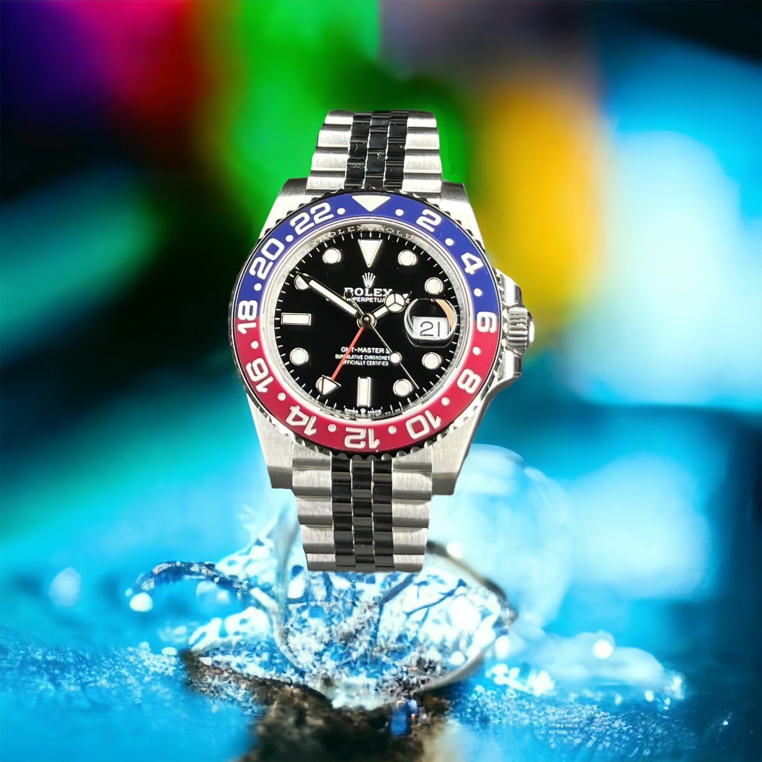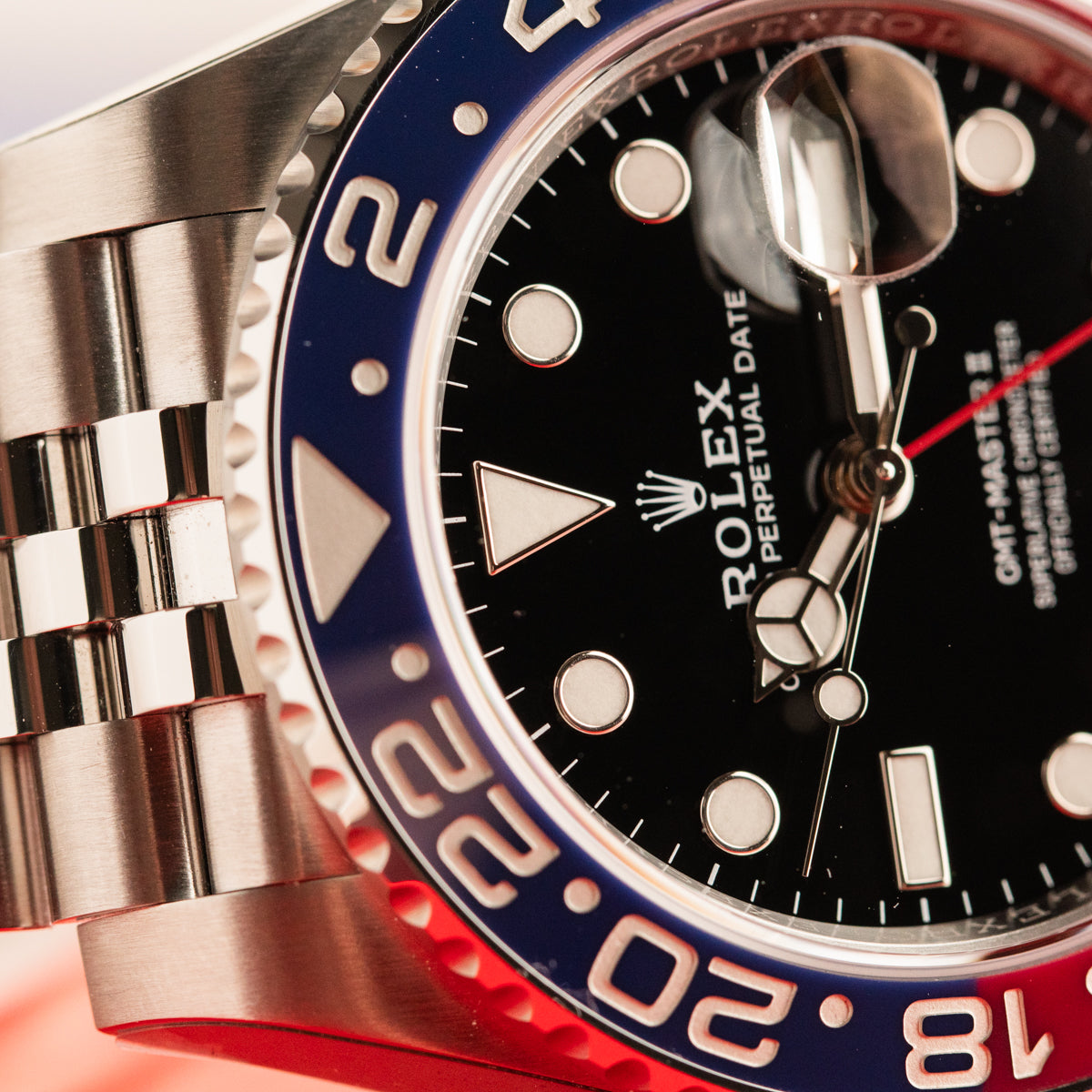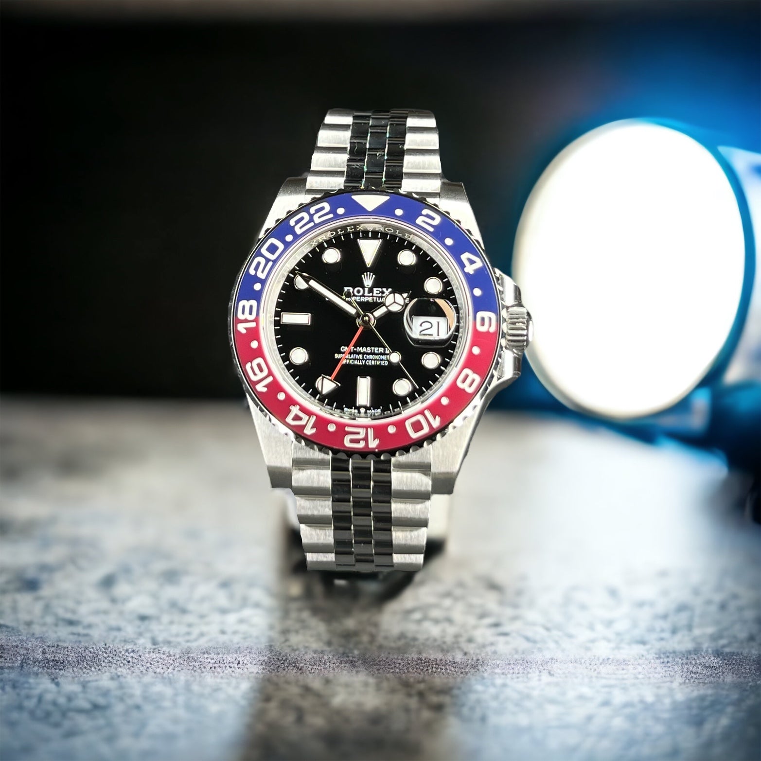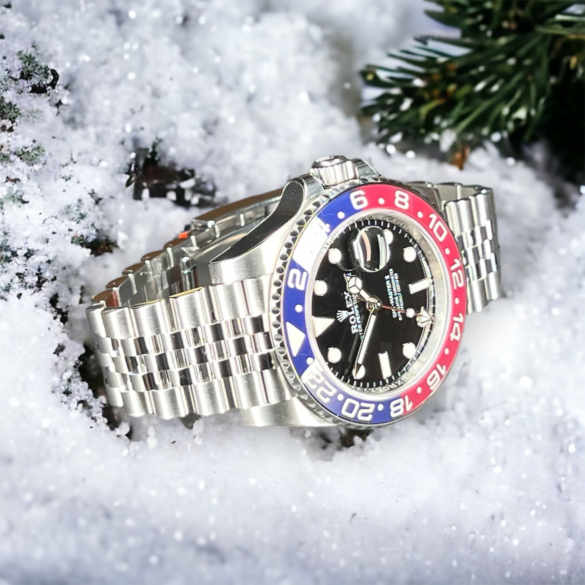 The Rolex GMT Pepsi, is the quintessential pilots watch. Seen on pilots from the Pan Am age until now. The 904L Stainless Steel case and bracelet, along with the bi-color Red & Blue ceramic bezel. The black dial with Superluminova index markers, and an extra red hand with triangle tip.