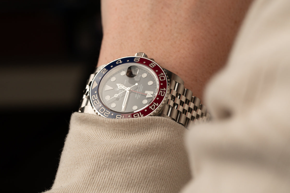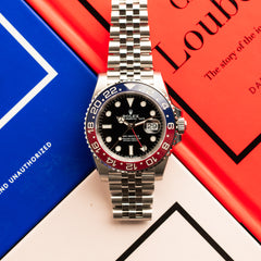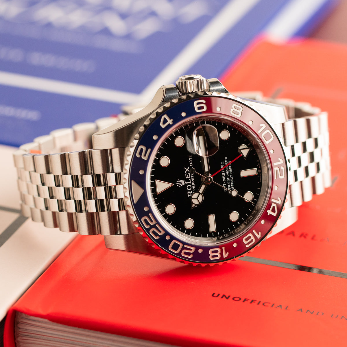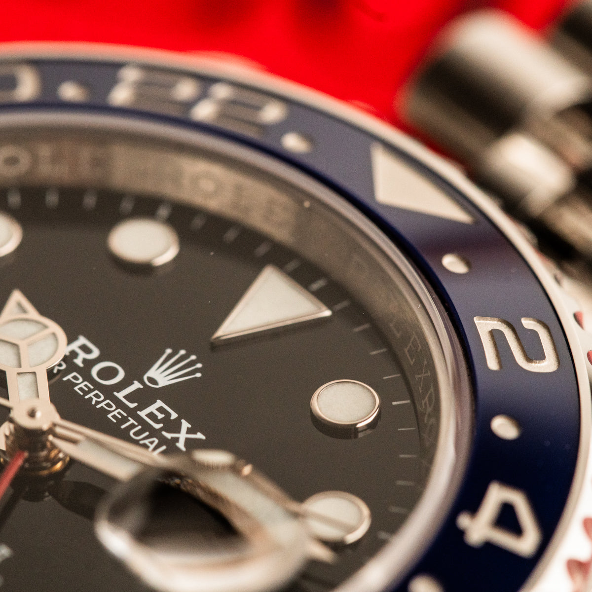 The Rolex GMT Pepsi, is the quintessential pilots watch. Seen on pilots from the Pan Am age until now. The 904L Stainless Steel case and bracelet, along with the bi-color Red & Blue ceramic bezel. The black dial with Superluminova index markers, and an extra red hand with triangle tip.