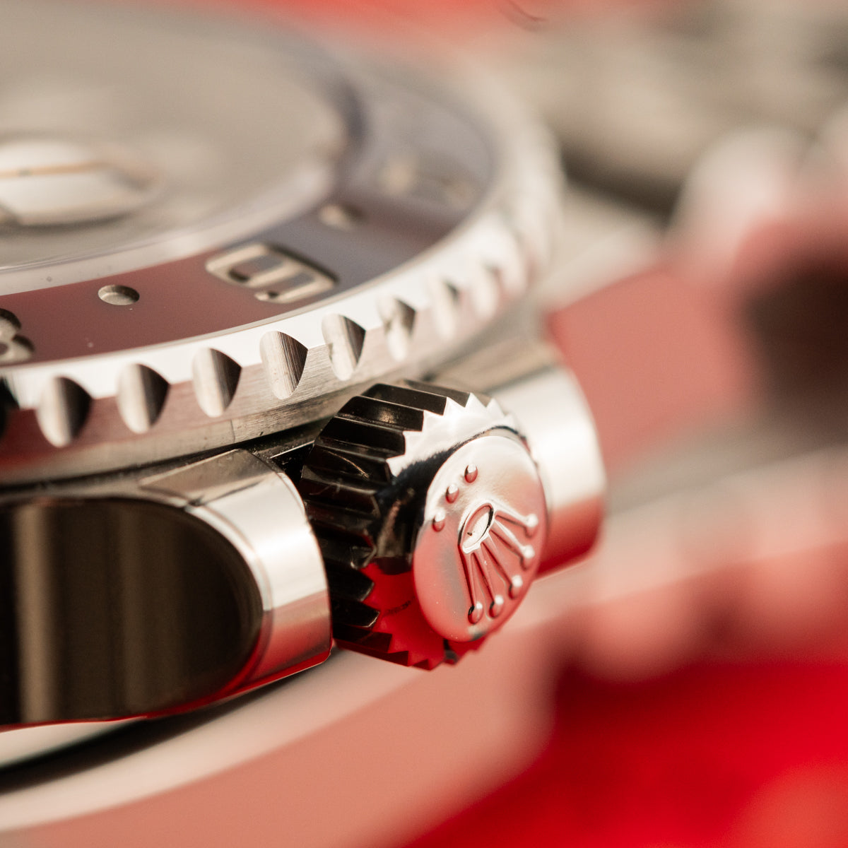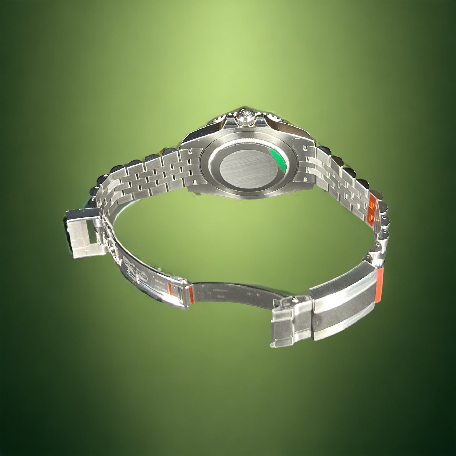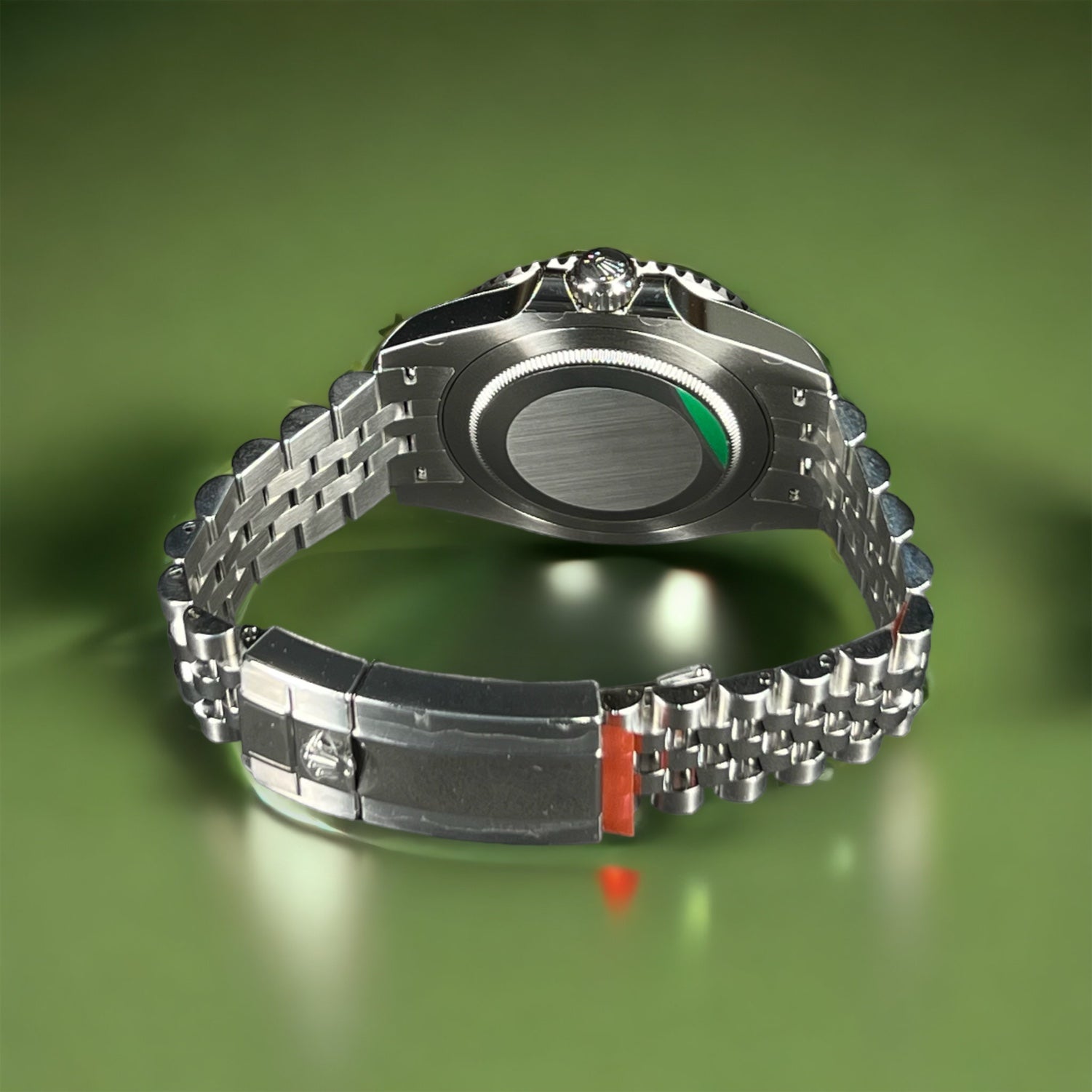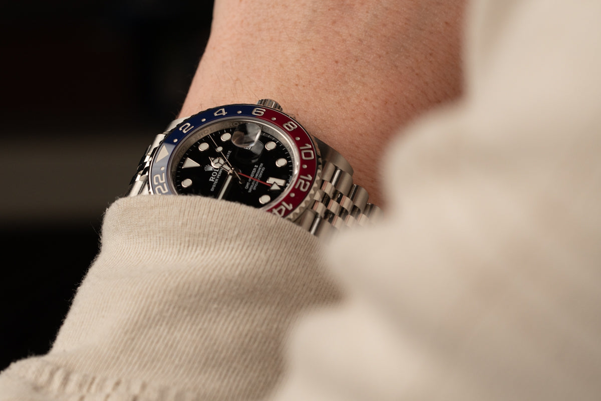 The Rolex GMT Pepsi, is the quintessential pilots watch. Seen on pilots from the Pan Am age until now. The 904L Stainless Steel case and bracelet, along with the bi-color Red & Blue ceramic bezel. The black dial with Superluminova index markers, and an extra red hand with triangle tip.