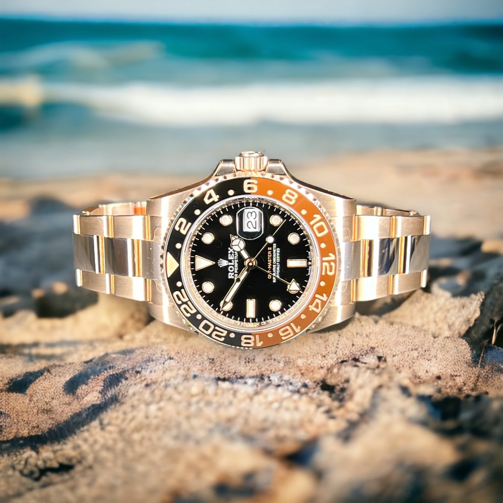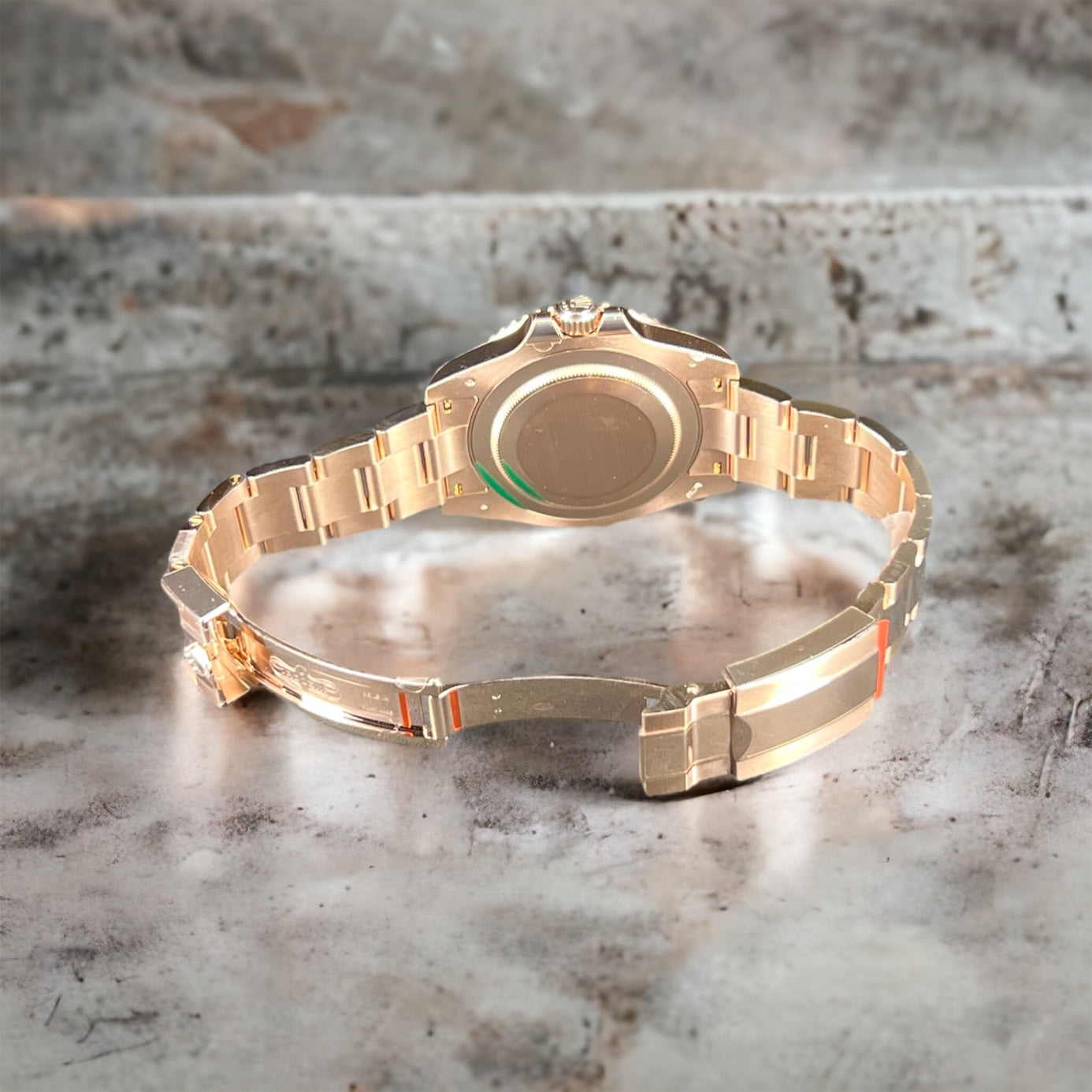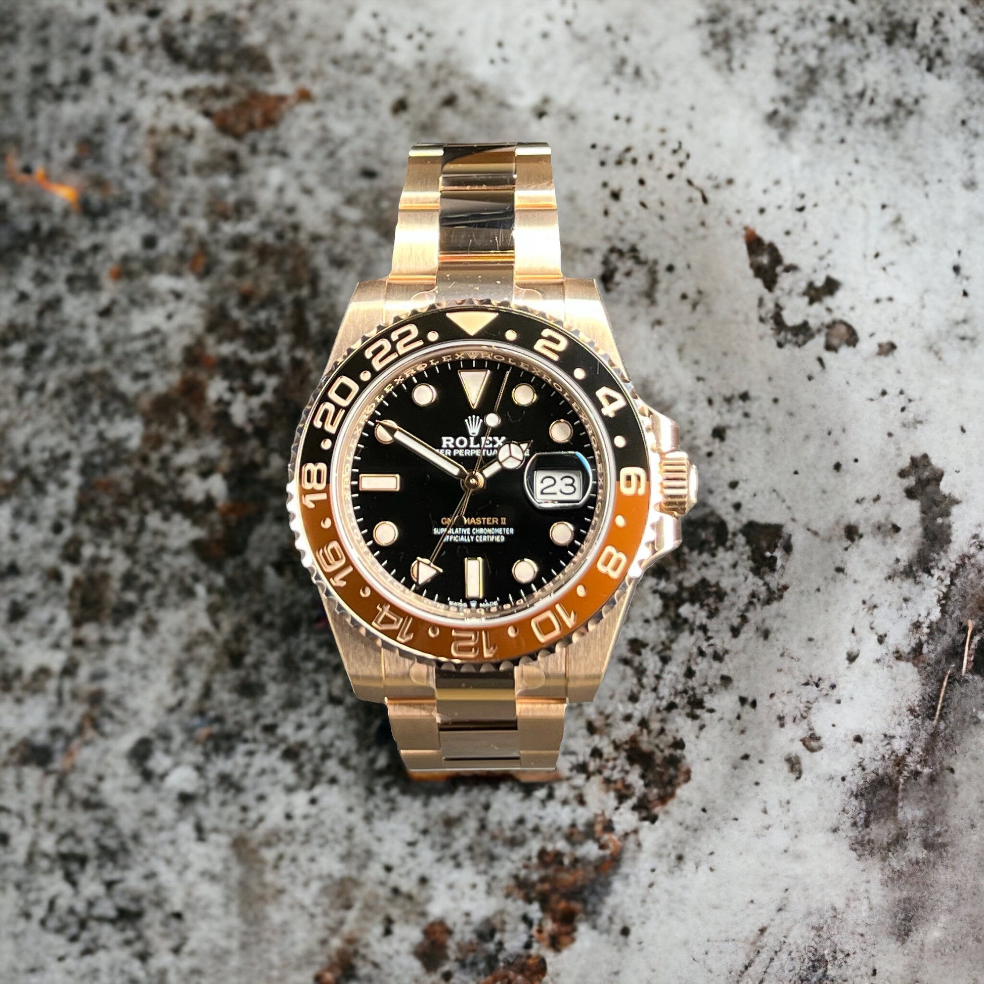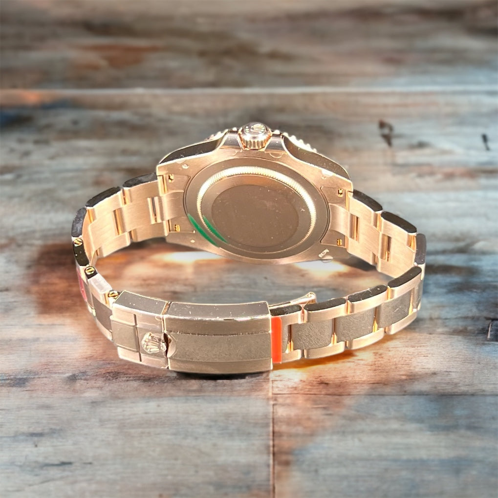 One of the rarest GMTs on the planet. The all 18k Everose Gold case and bracelet with a bi-color bezel. Black lacquered dial with Superluminova index markers. Extra rose gold hand with triangle marker.