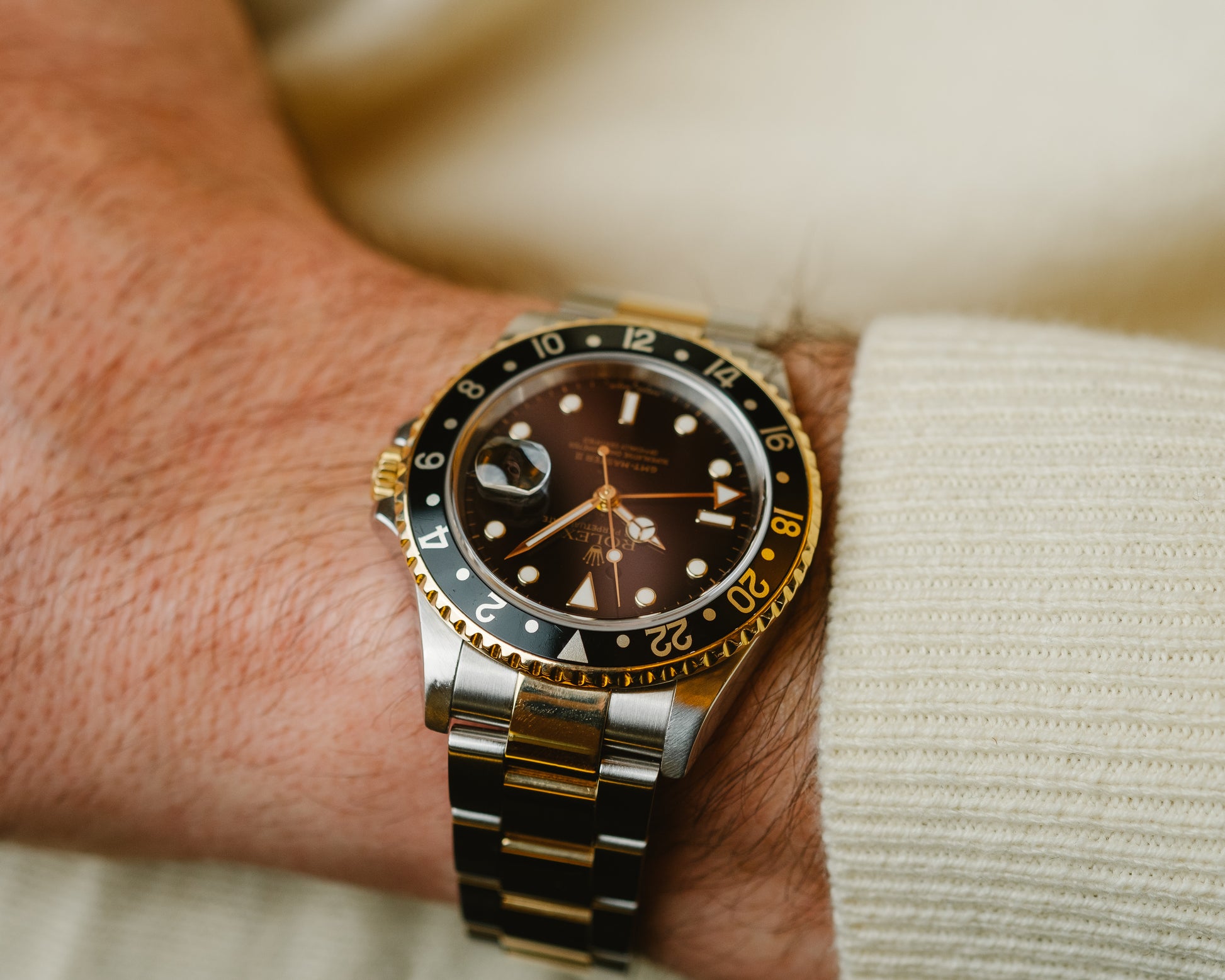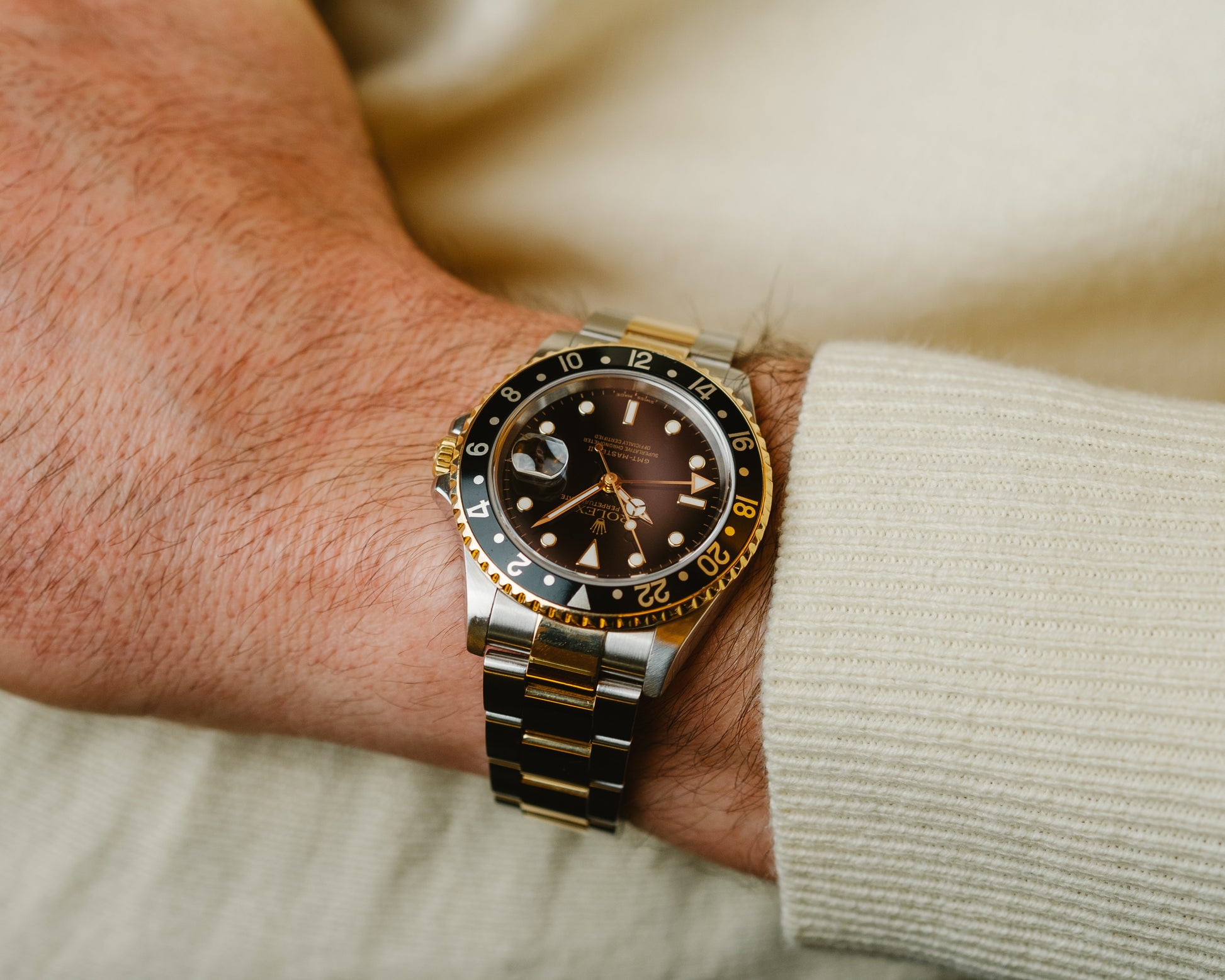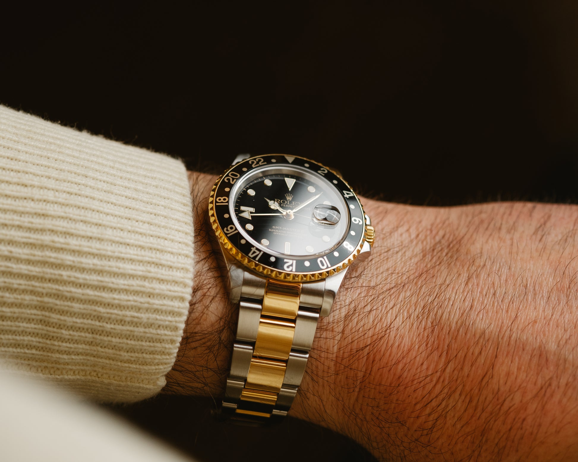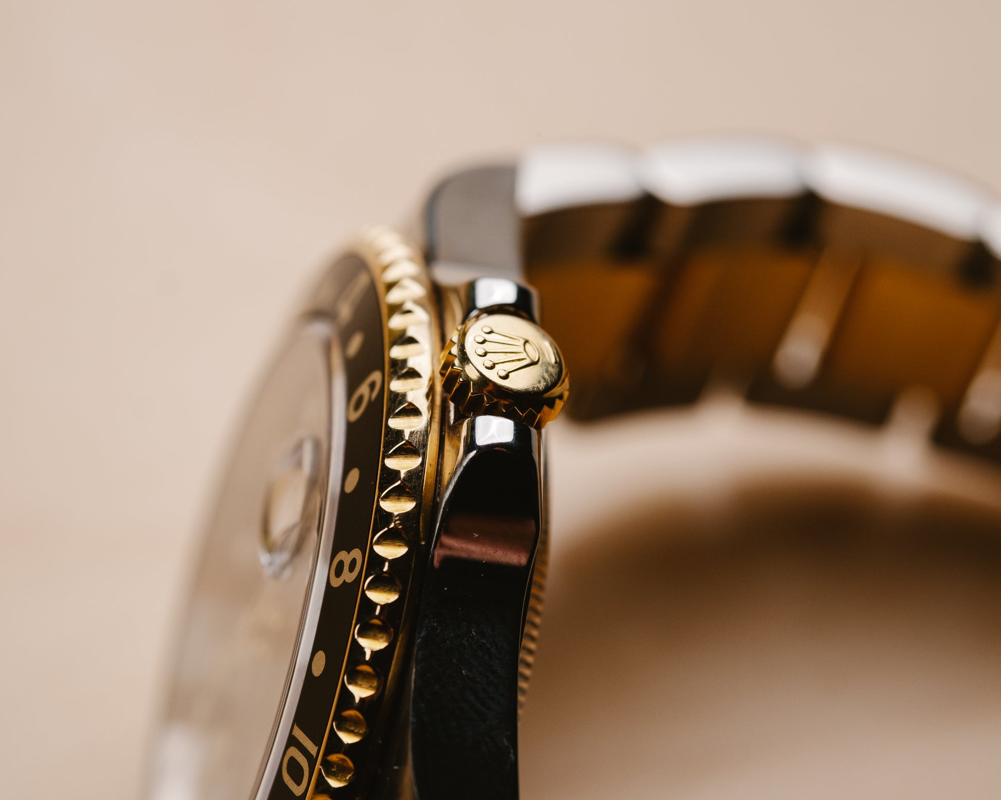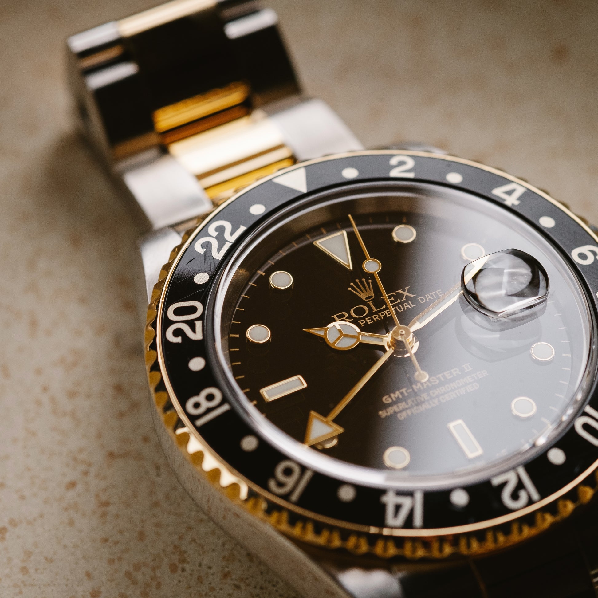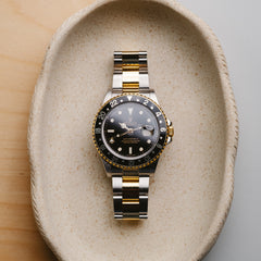 Explore our pre-owned Rolex GMT Master 2 featuring stainless steel and 18 karat yellow gold, with an Oyster link bracelet and a striking black dial. This timepiece boasts a sapphire crystal and comes complete with its original box and certificate. Crafted circa 2004, it was originally sold by Jackson Jewelers, bearing reference 16713. Notably, it underwent a full service in 2023, ensuring its impeccable performance and longevity. Discover the timeless allure and precision of this iconic watch, perfect for discerning collectors and enthusiasts alike.