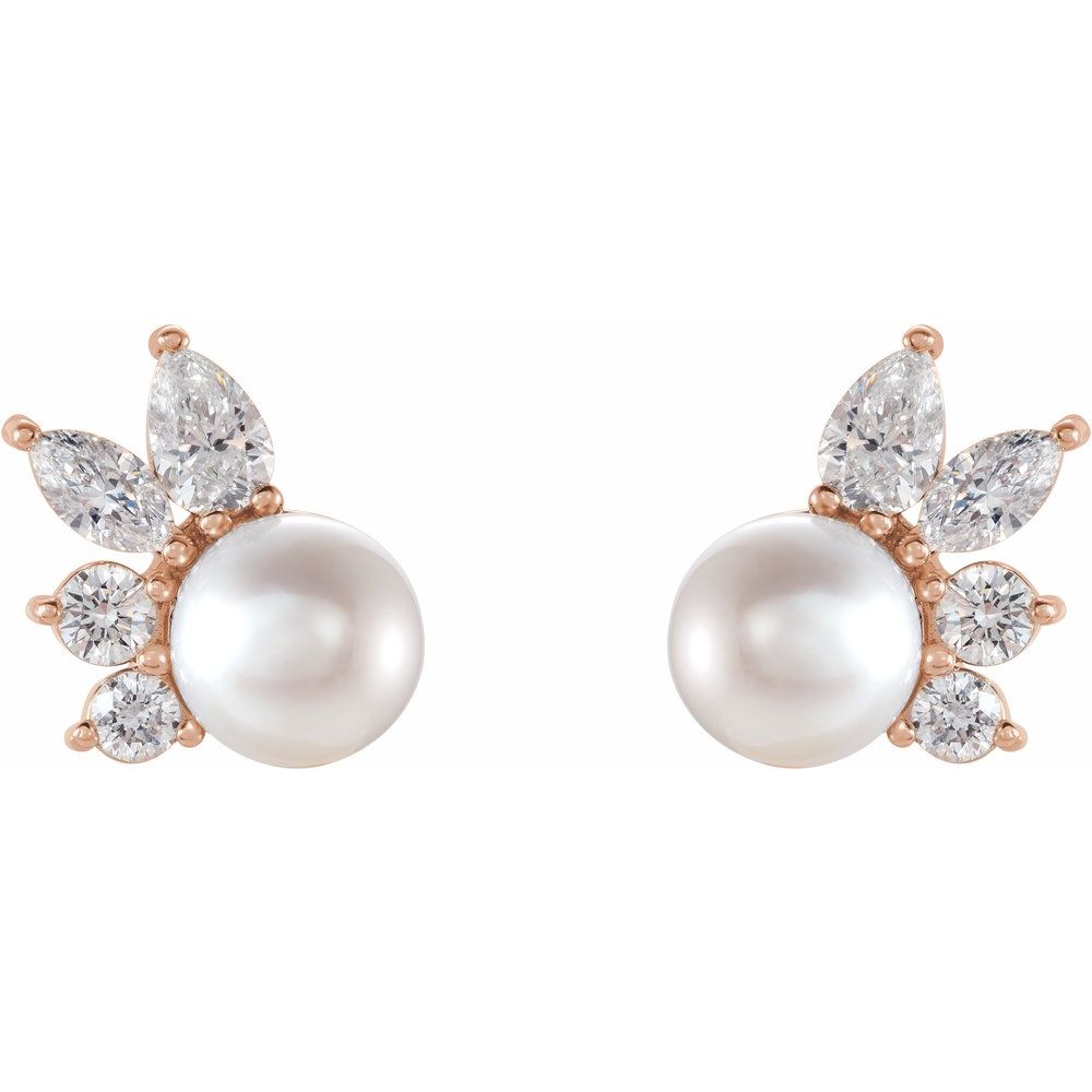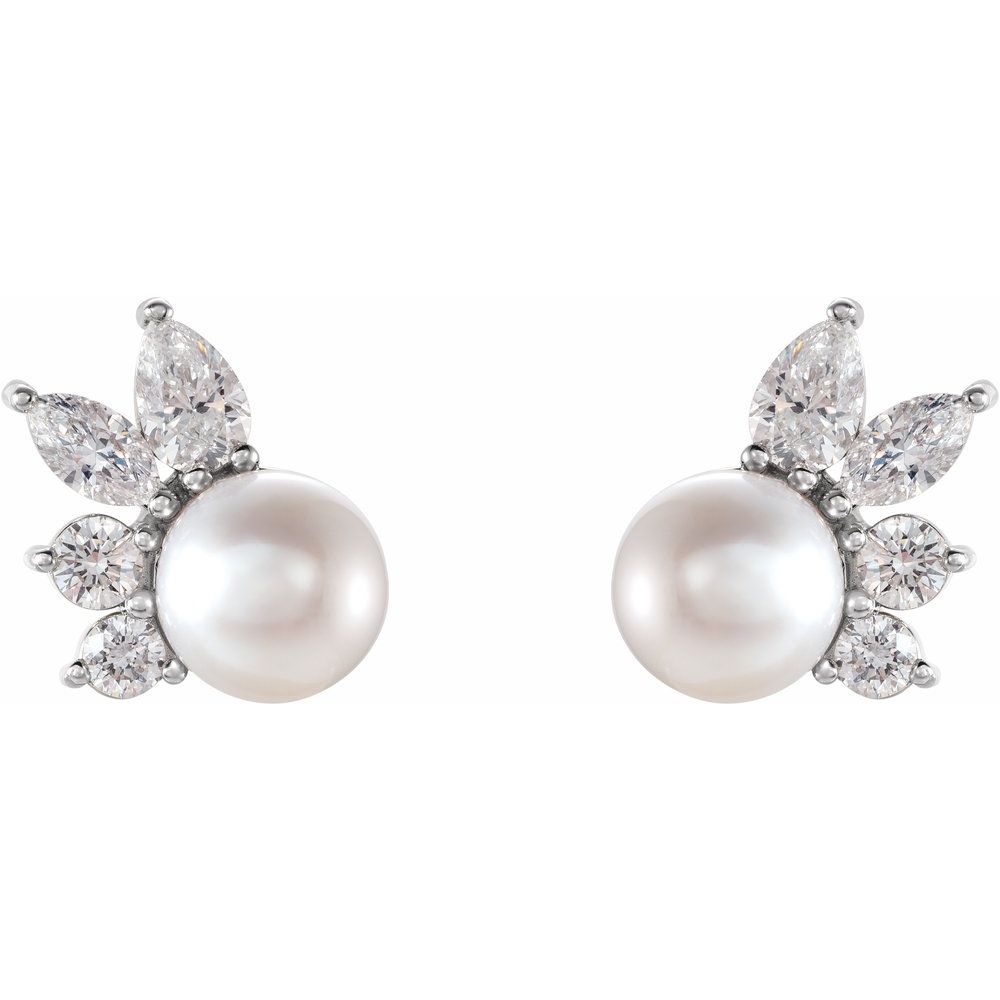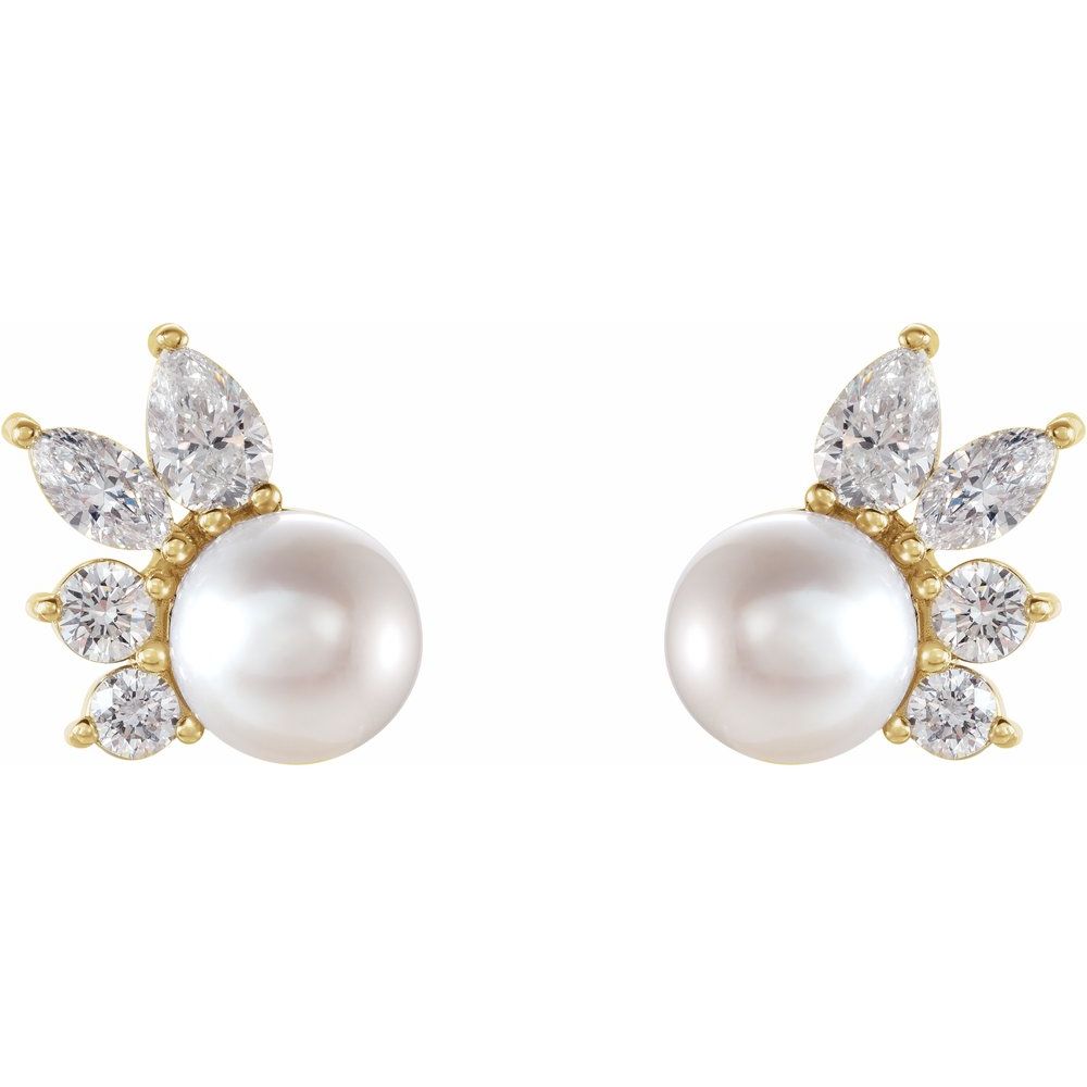 A luminous 5.5mm premium white Akoya cultured pearl is beautifully framed by a fan-shaped cluster of natural diamonds in marquise Pear and round brilliant cuts. Crafted in solid 14K gold with a polished finish, these elegant stud earrings are secured with friction backs and sold as a pair.