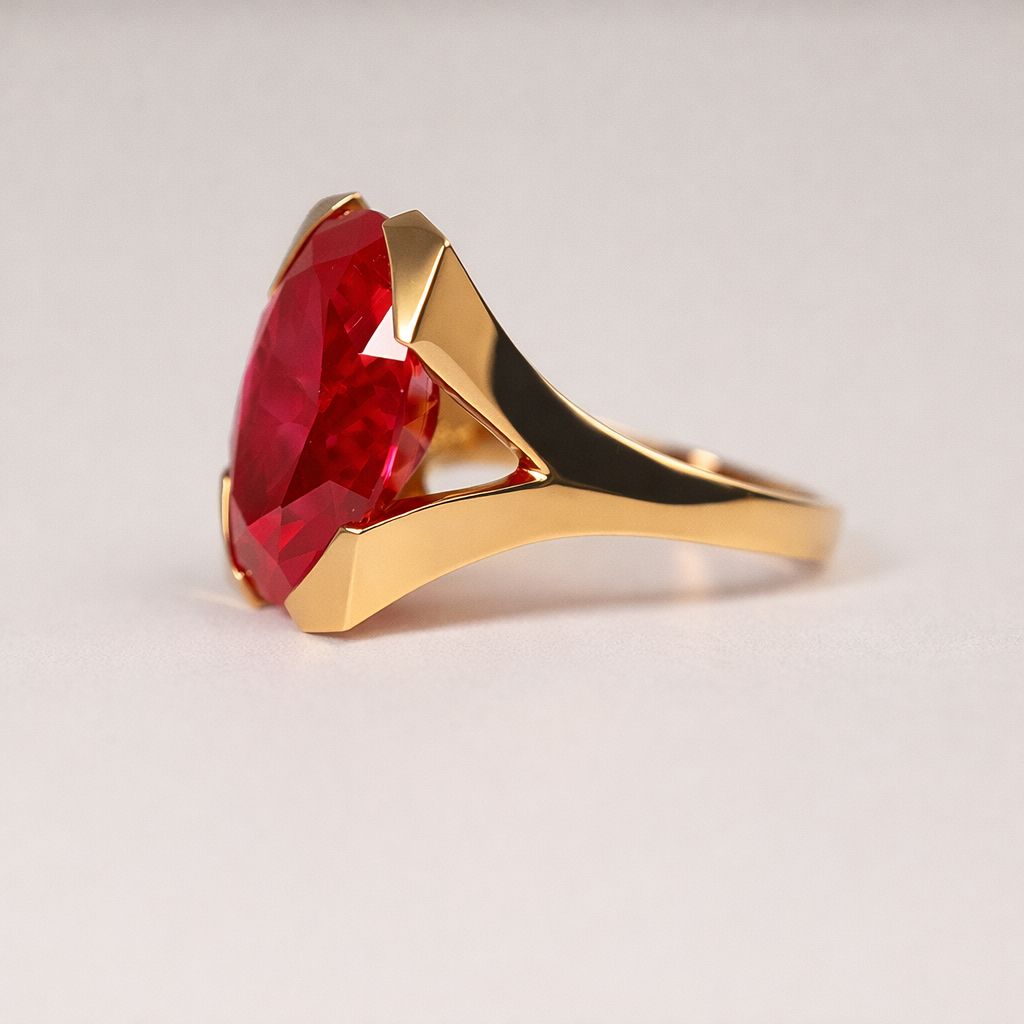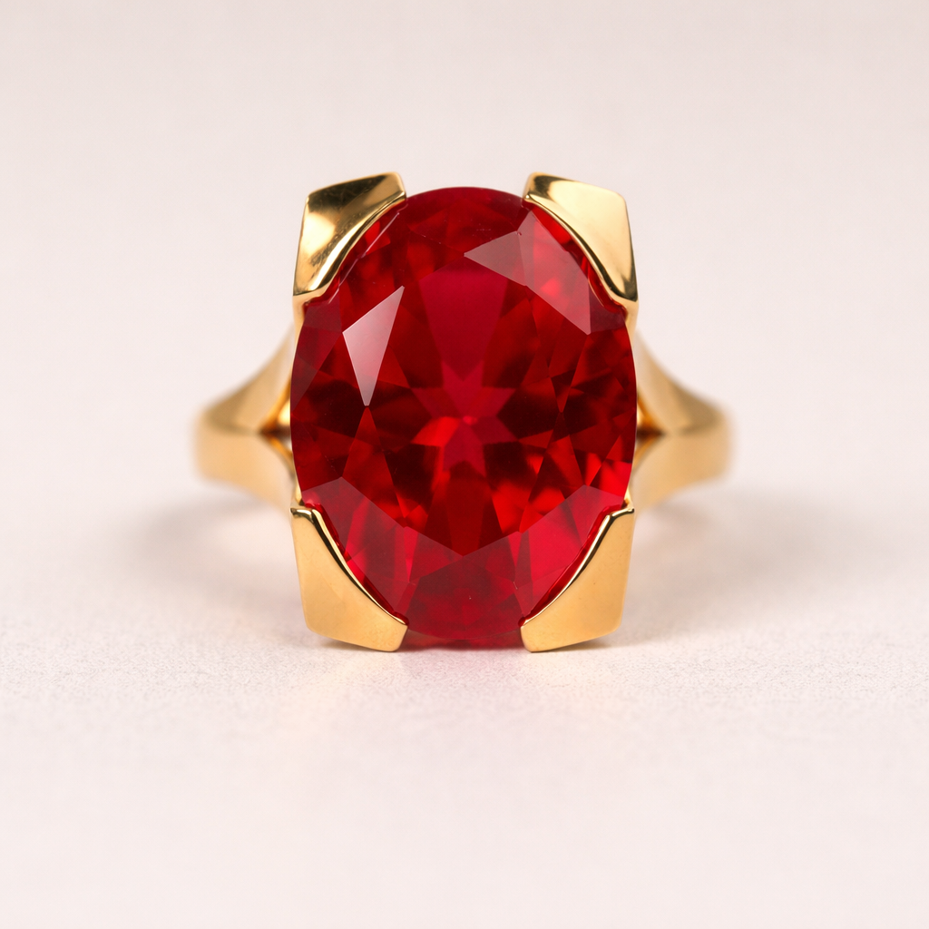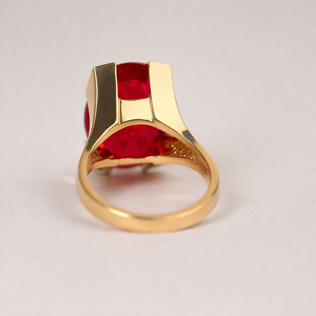 This striking 14K yellow gold fashion ring features a bold oval-cut synthetic ruby measuring 20 × 15 × 9 mm, with a calculated weight of 17.00 carats. The ruby displays the rich red hue synthetic ruby is known for, making it a true statement piece.