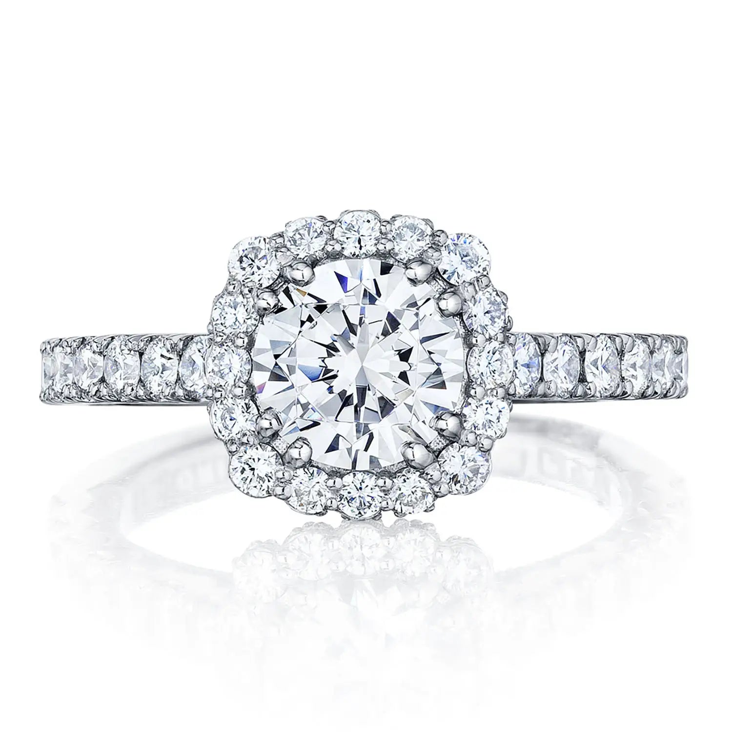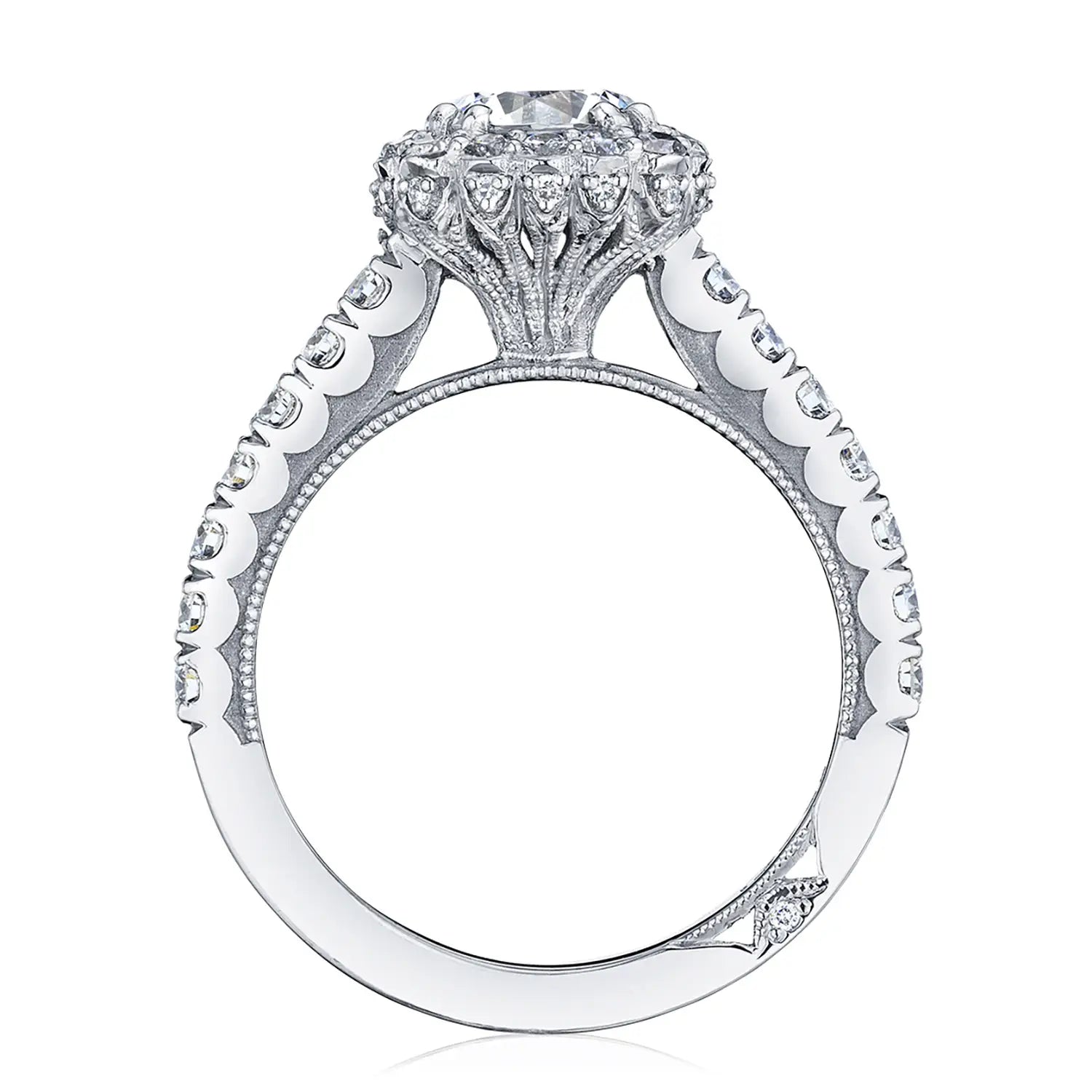 Discover the exquisite beauty of the Tacori Bloom Engagement Ring- a true gem in 18 karat white gold. This stunning ring, with its 3/4 carat round center stone to be set and 40 round diamonds totaling .87 carats, radiates luxury and sophistication. Come experience it for yourself at Jackson Jewelers.