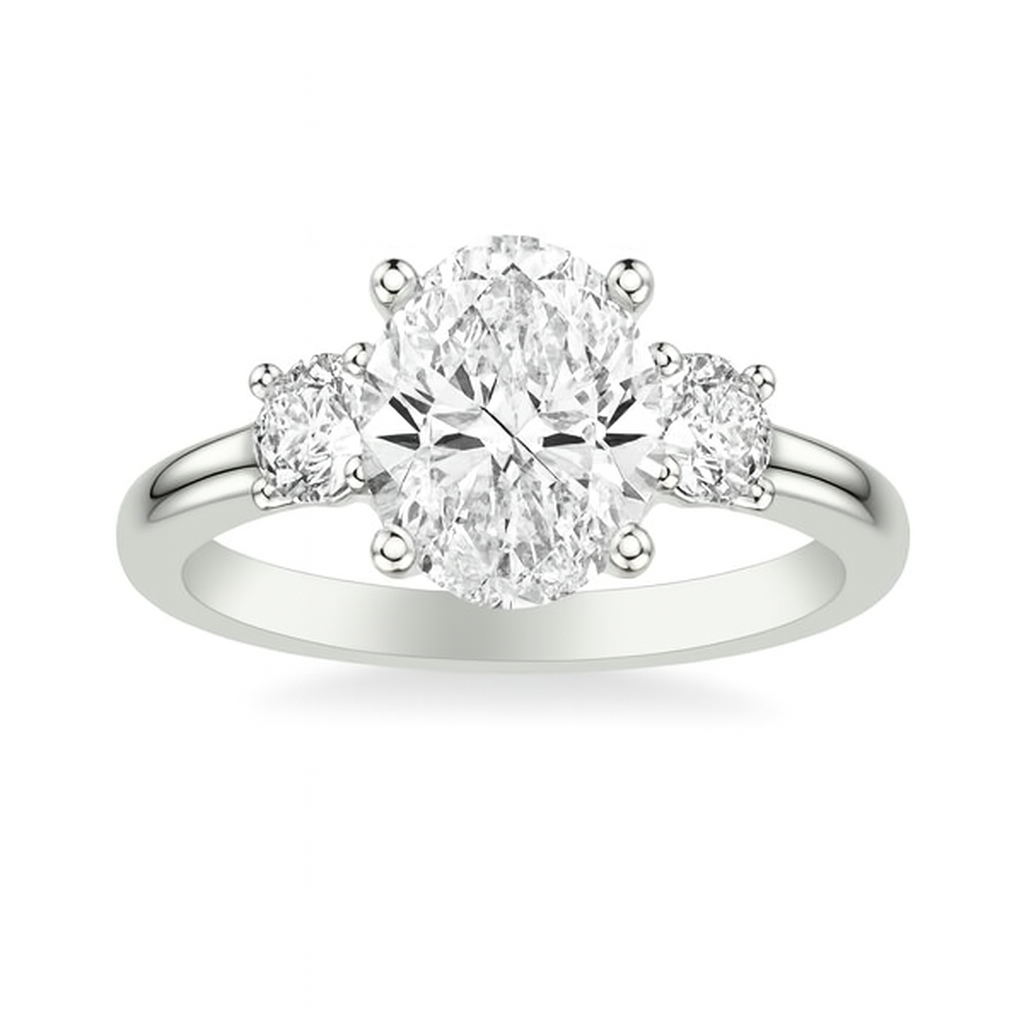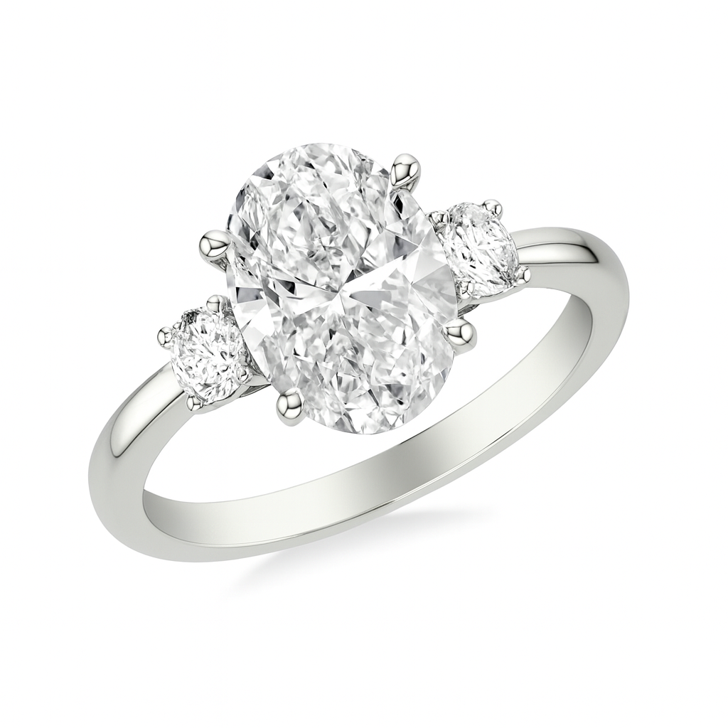 From our Jackson Jewelers Private Label collection, this custom designed three stone engagement ring features a striking 3.27ct lab created oval cut diamond at the center (G color, VS1 clarity, 12.31 x 8.46 x 5.14mm), certified by IGI #LG706547812. Flanking the center stone are two natural round brilliant cut diamonds with a combined total weight of 0.75ct, graded GH color and VS clarity, adding brilliance and balance to the design. Crafted in style #31-12210RVRP, this ring is currently a finger size 6.5 and can be sized up two sizes or down one.