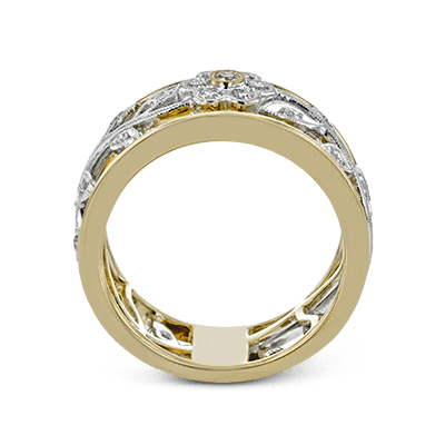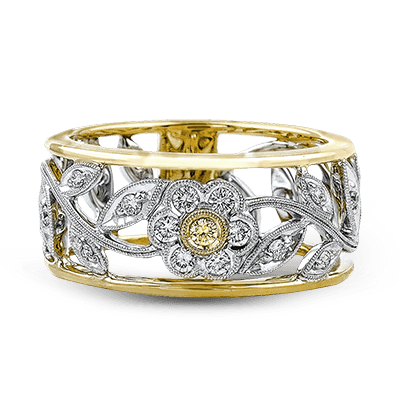 This retro-inspired 18k Yellow & white gold ring features an elegant floral design in white and yellow gold, accented with 0.28 ctw round white diamonds and 0.03 ctw yellow diamond accents. A bold 9.00mm wide band adds timeless character and presence.