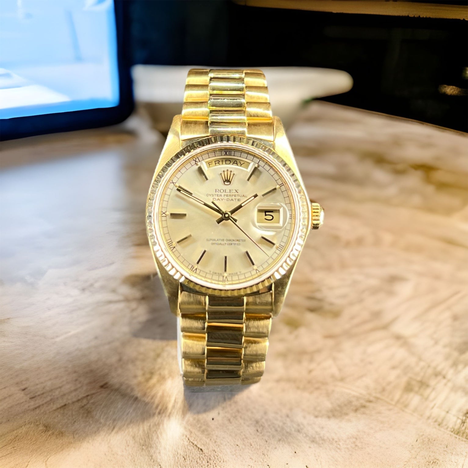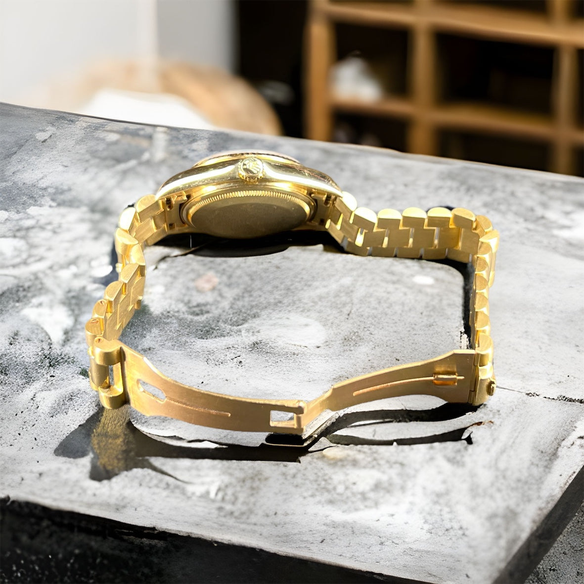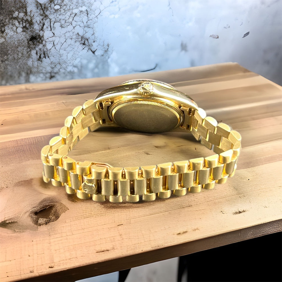 The watch worn by the most presidents ever.  An all 18k Yellow Gold case and bracelet, with diamonds set around the bezel ring and open the all mother of peal diamond dial.